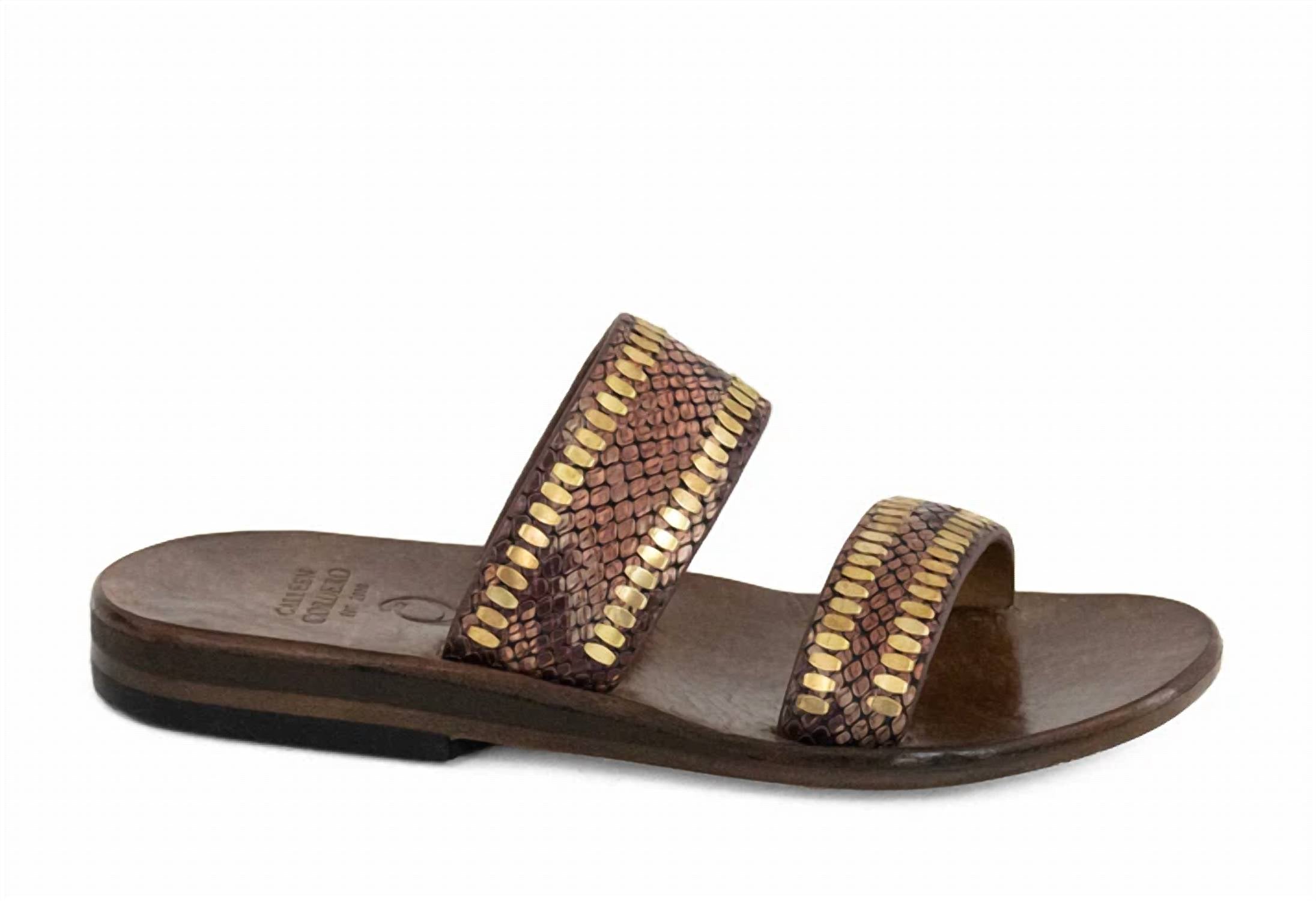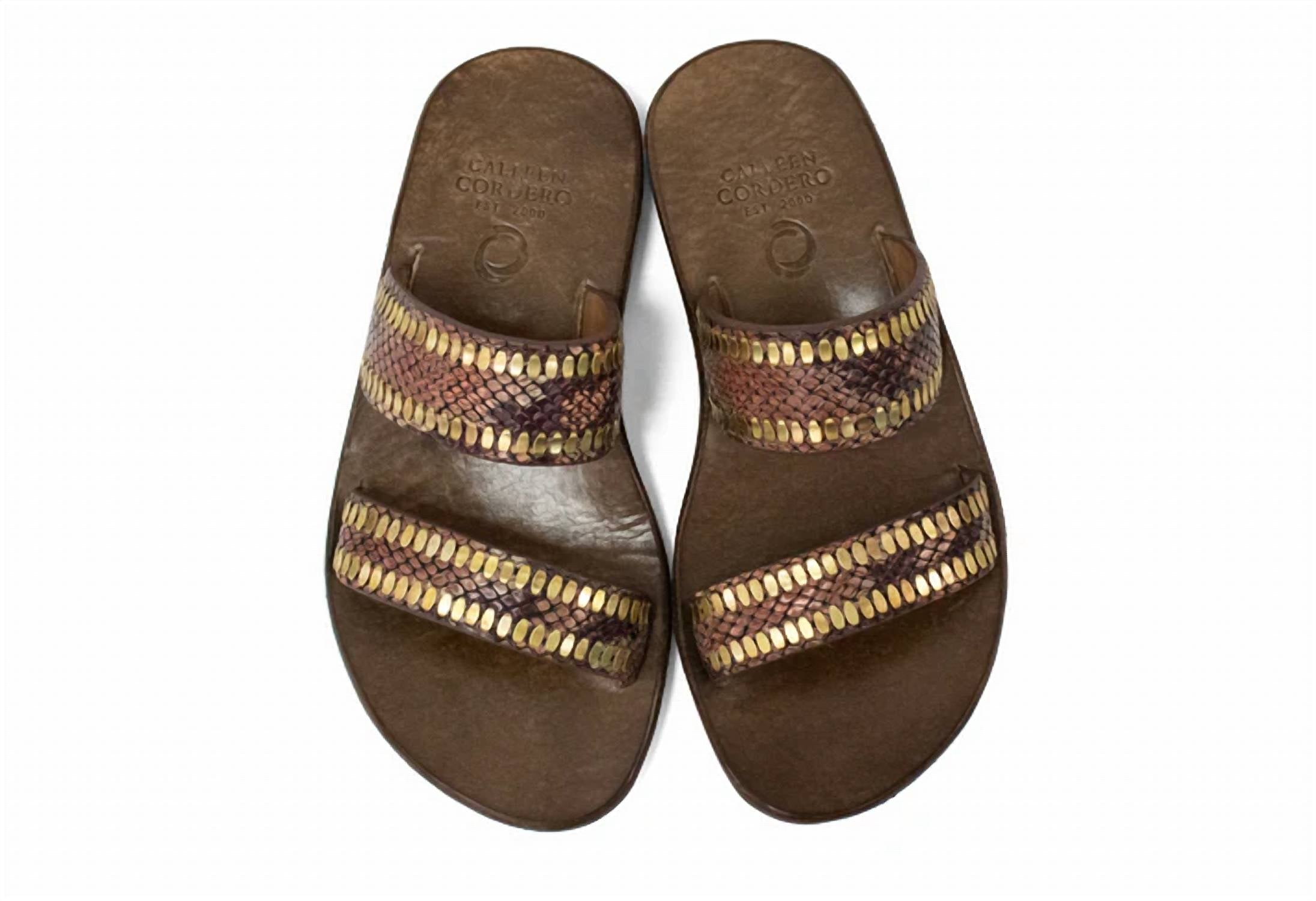 Esta sandália irá levá-lo do brunch ao jantar e a tudo o que estiver entre eles. Entre na elegância sem esforço em uma fusão deslumbrante de artesanato intrincado e estilo exclusivo. Exiba uma sofisticada estampa de cobra em relevo, toda em couro, em um atraente tom cobre multicolorido. Adornada com requintadas obras de arte em latão maciço cravejadas à mão. Cada par é uma prova da arte meticulosa que define a marca. Apresenta uma palmilha de couro moldada à mão projetada para o máximo conforto. Suportada por uma entressola de EVA que oferece suporte excepcional ao arco. Sandálias feitas à mão estão disponíveis em quantidades limitadas, tornando-as um achado raro. Mergulhe no luxo e destaque-se com um calçado essencial que é tão único quanto você. Feito com amor e precisão.
