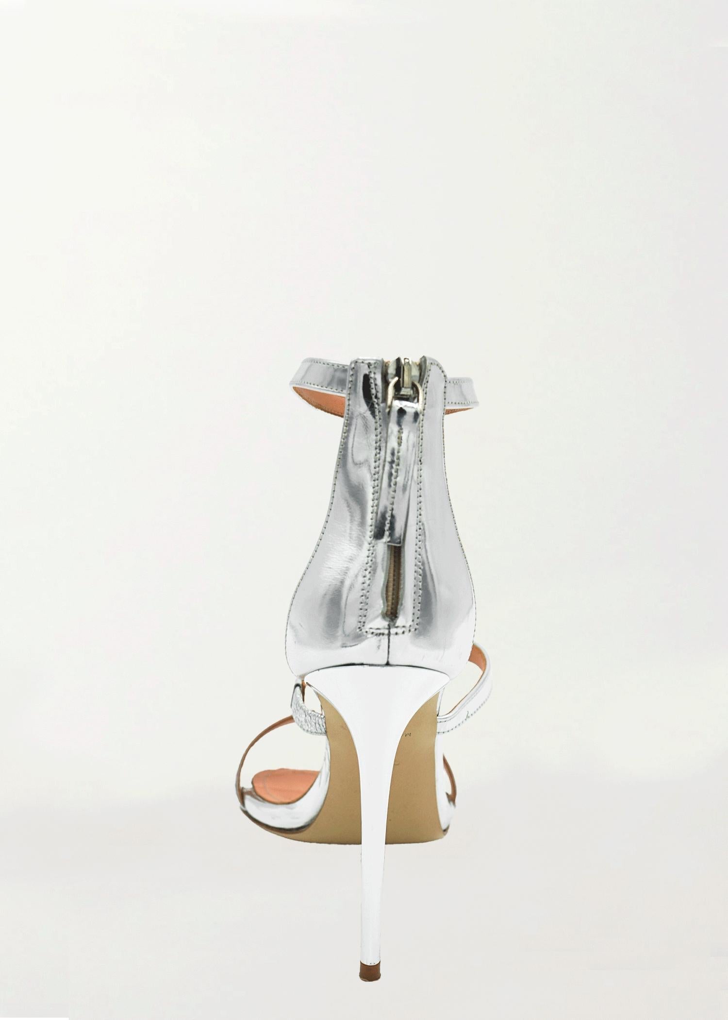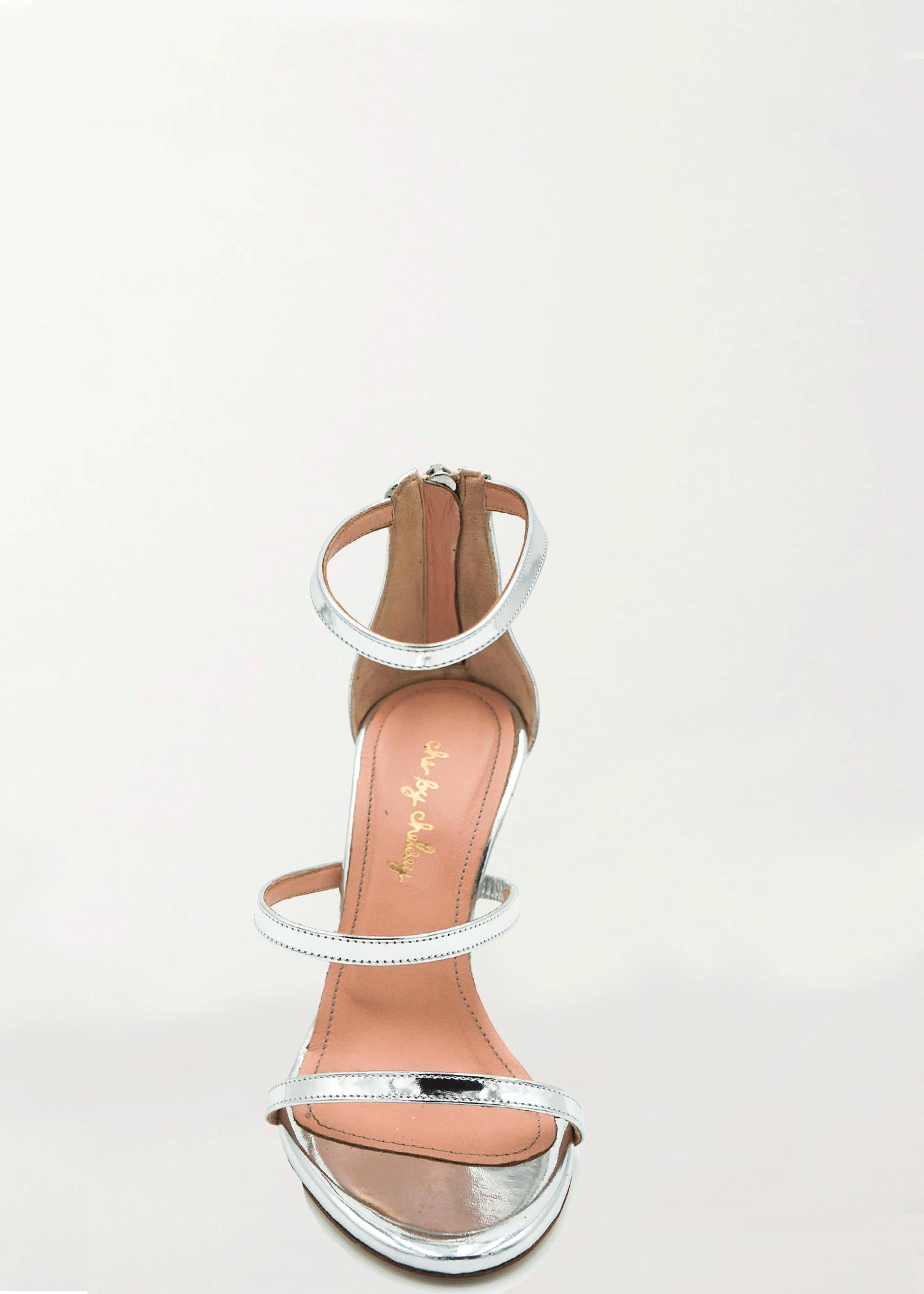 Clássico e fofo, perfeito para usar o dia todo. Adoramos esta sandália. Apresentamos a Sandália Feminina Calypso com Salto Tira da Che by Chelsey, confeccionada meticulosamente na Itália para a fashionista exigente. Estas sandálias ostentam um luxuoso cabedal em couro espelhado e uma sofisticada biqueira amendoada, complementadas por um elegante salto agulha para uma silhueta elegante. Elas fecham convenientemente na parte de trás com um zíper, garantindo um ajuste seguro para qualquer evento noturno. O calçado possui sola de couro e vem em um deslumbrante Silver Specchio, perfeito para festas de primavera.