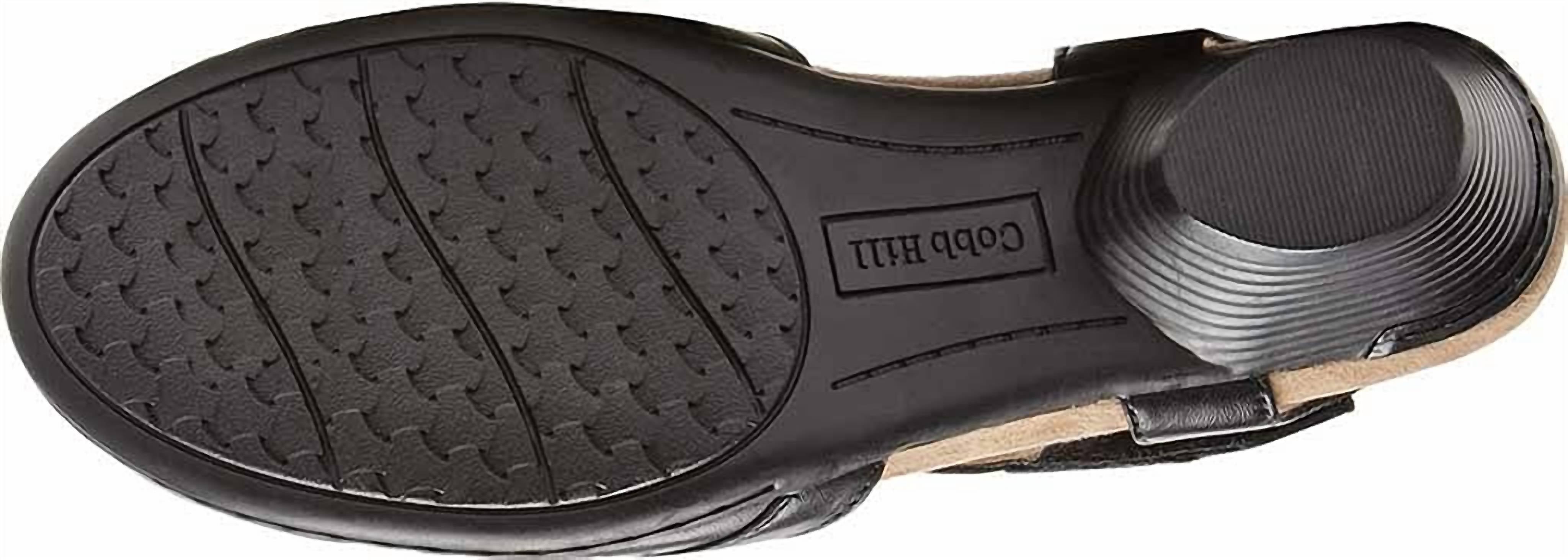 Flowy dresses, cropped pants, and even jumpsuits... this sandal works with them all! Step into sophistication with Cobb Hill's Women's Laurel Mary Jane Sandal in sleek black. Crafted from premium leather, this sandal features a round toe and a medium width for comfort. Its block heel, standing at 1.63 inches, provides a stylish yet stable lift, making it the perfect choice for a spring holiday party. The sole made of Thermoplastic Elastomers ensures durability and comfort, while the preppy design complements any elegant ensemble.