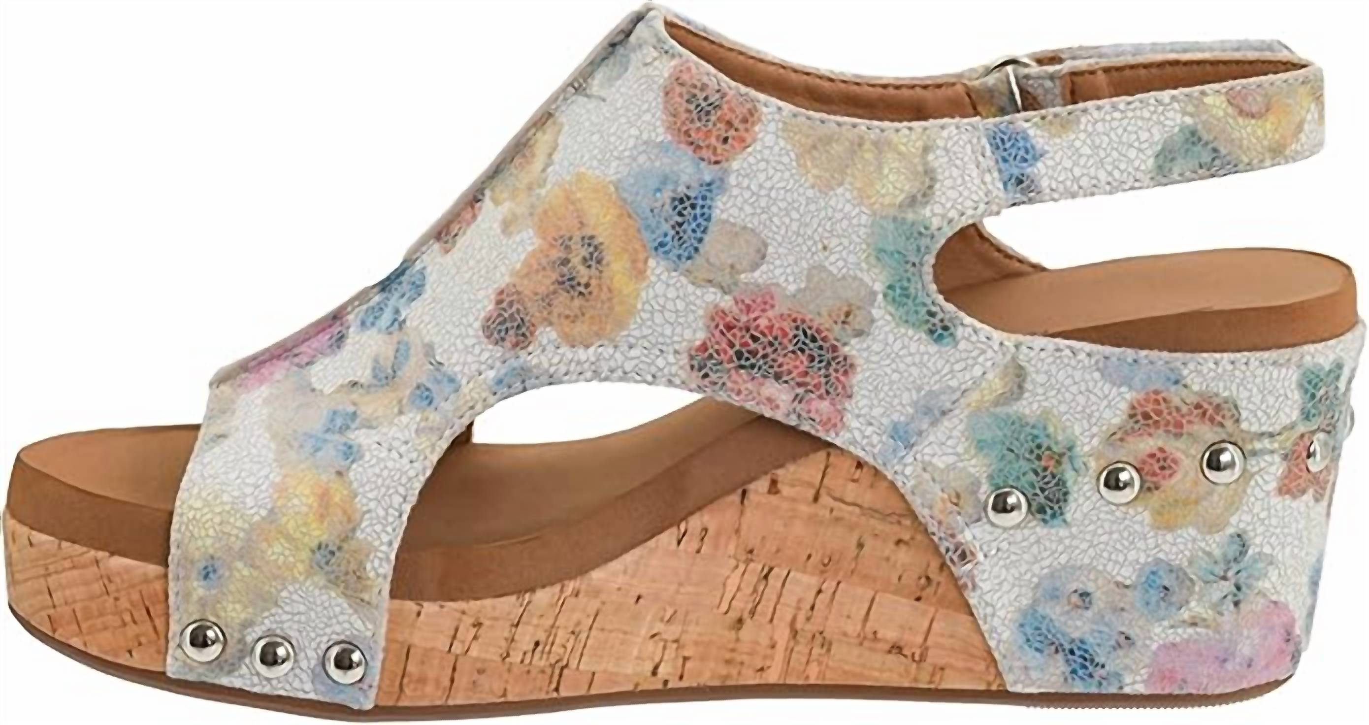 Dresses, denim, shorts... these wedges go with just about anything. Step into the season with Corkys Footwear's Women's Carley Wedge Sandal, featuring a striking Putty Washed Flower print. These Boho Chic sandals boast a comfortable 3" wedge heel, fitting perfectly with a medium shoe width. The open toe design and adjustable Velcro ankle strap offer both style and function, ready for a Thanksgiving vacation or any fall occasion. Made for easy wear, these sandals promise comfort you'll love without a desire to take them off.