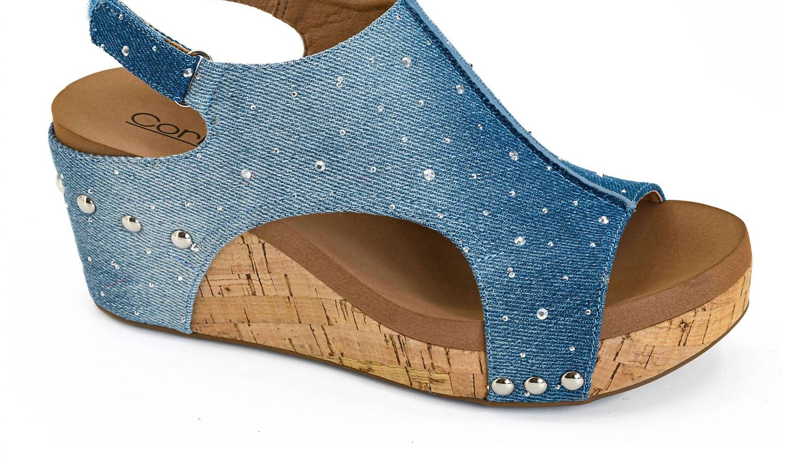 Sapatos plataforma atemporais que serão relevantes estação após estação. Incremente seu estilo de verão com as Sandálias Carley Wedge Femininas da Corkys Footwear em Denim Claro com Strass, uma escolha impecável para coquetéis ou festas festivas. Estas sandálias apresentam um cabedal sintético com fecho de velcro seguro, perfeitamente equilibrado em um salto de cortiça de 6 cm. A palmilha de espuma EVA oferece conforto e suporte incomparáveis, tornando-as as sandálias ideais para elevar seus looks inspirados no Y2K. Desenhadas com bico redondo e destinadas a mulheres adultas, estas sandálias anabela prometem estilo e conforto para qualquer ocasião.