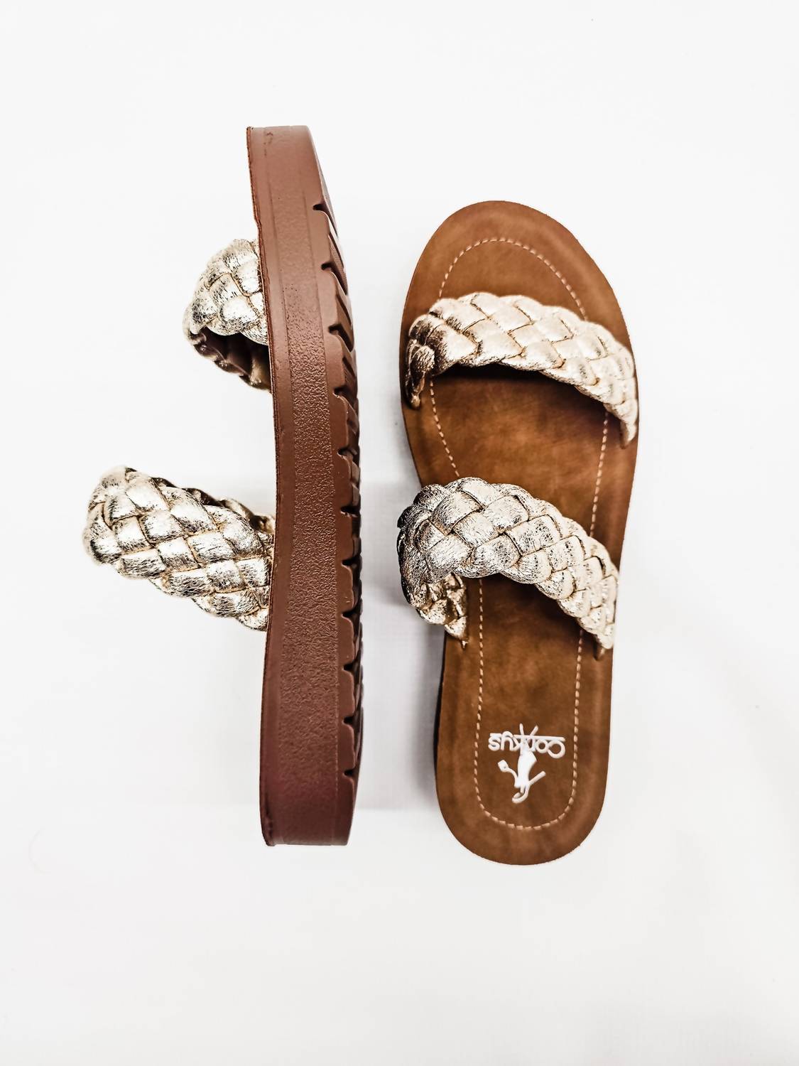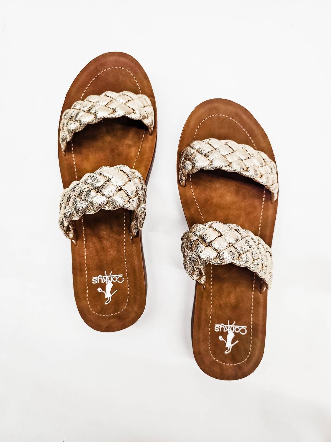 Clássico e fofo, perfeito para usar o dia todo. Adoramos esta sandália. Entre no verão com as sandálias femininas Wind It Up da Corkys Footwear, com tiras douradas trançadas que dão um toque divertido e moderno a qualquer look. Com palmilha marrom e bico aberto, estas sandálias são perfeitas para férias ou comemorações do Cinco de Mayo. Com salto baixo de 3,1 cm, elas oferecem conforto e estilo para qualquer ocasião ensolarada. Observação: estas sandálias são pequenas, por isso é recomendável escolher um tamanho maior se você tiver pés largos ou estiver entre tamanhos diferentes.