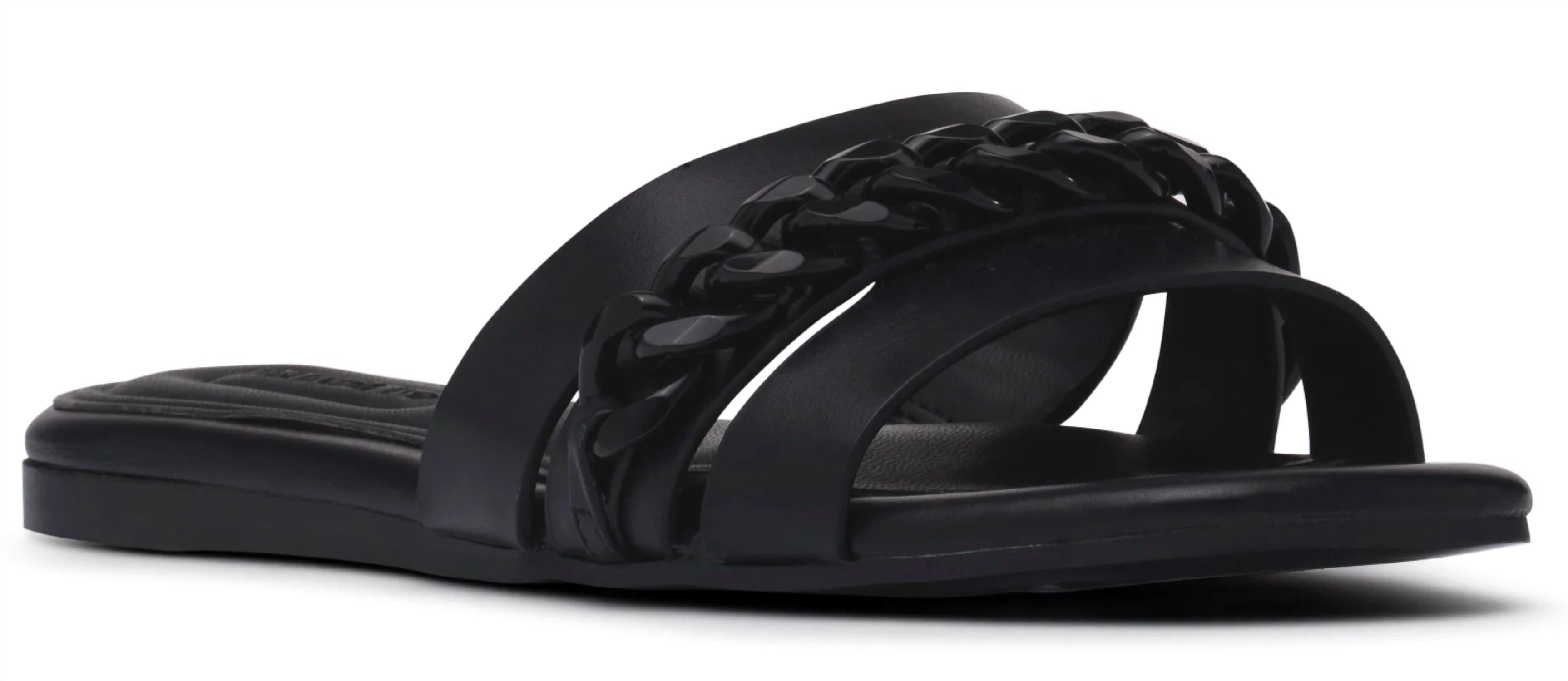 This sandal will take you from brunch to dinner and everything in between. Step out in style with the Women's Kieryn Sandal by D'Amelio Footwear. This minimalist sandal showcases a chic monochromatic chain detail, perfectly complementing its sleek black color. Designed with an open toe and flat heel, it's an understated choice for spring dinner parties or a Thanksgiving celebration. Enjoy both comfort and elegance with this standout piece in your wardrobe.