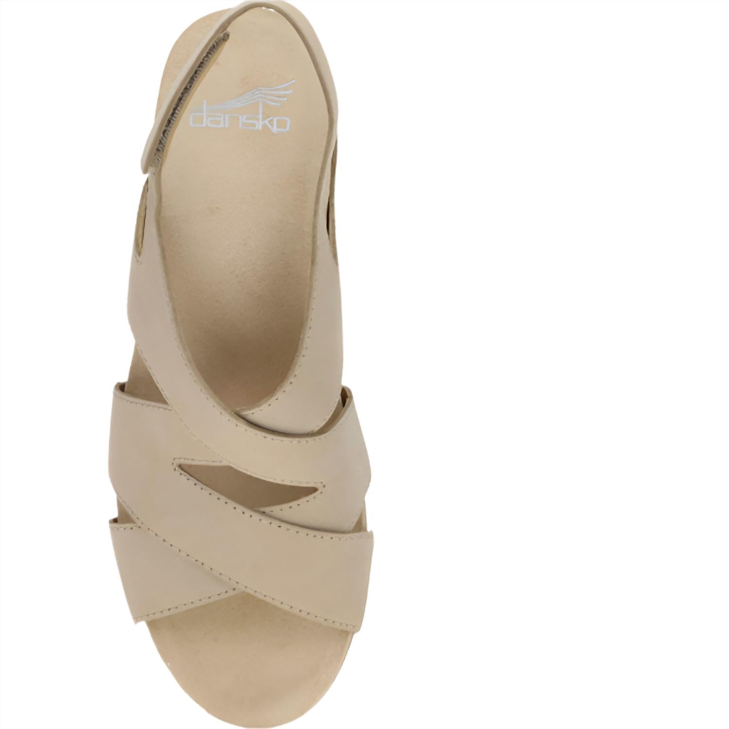 Embrace summer style with the Women's Shyla Wedge Sandals by Dansko in elegant Sand Milled Nubuck. These sandals feature an adjustable slingback strap with hook-and-loop closure for easy wear. The design boasts a 3" heel and a 1.75" platform, enhanced with a leather upper and lining, along with a rubber sole. Perfect for a minimalist look, they're imported and ideal for a holiday party, like Thanksgiving.