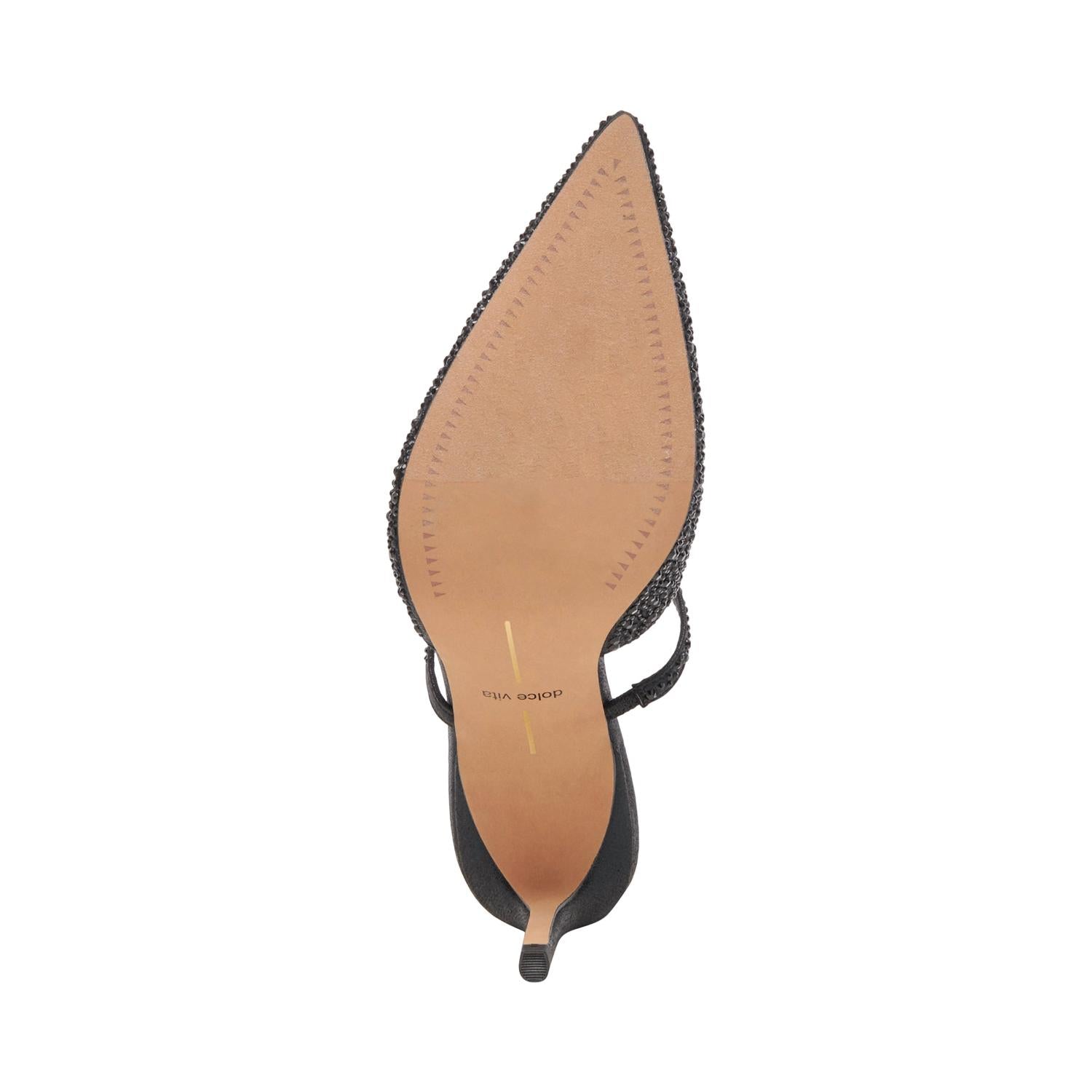 Salto afunilado e silhueta pontuda com detalhes em cristais em malha translúcida. Cabedal em tecido e cristais, solado sintético reciclado, forro e meia sintéticos. Salto de 8,3 cm.