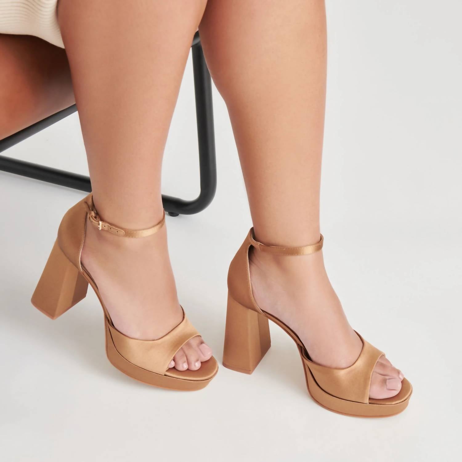 Combine essas belezas com sua calça jeans skinny favorita ou vestido para uma saída à noite na cidade. Apresentamos a Sandália de Salto Plataforma Pandro Feminina da Dolce Vita, uma escolha sofisticada para elevar o seu look de noite. Confeccionada em cetim marrom médio com cabedal têxtil e sintético, esta sandália de salto apresenta uma silhueta estilosa dos anos 90, complementando perfeitamente vestidos curtos e calças de perna larga. Apresenta solado sintético reciclado, forro em couro alternativo à base de água e meia para uma elegância sustentável. Com salto de 9,4 cm e plataforma de 3,8 cm, estas sandálias oferecem dimensões robustas para uma plataforma perfeita, mantendo-se fiéis ao tamanho para um ajuste confortável.