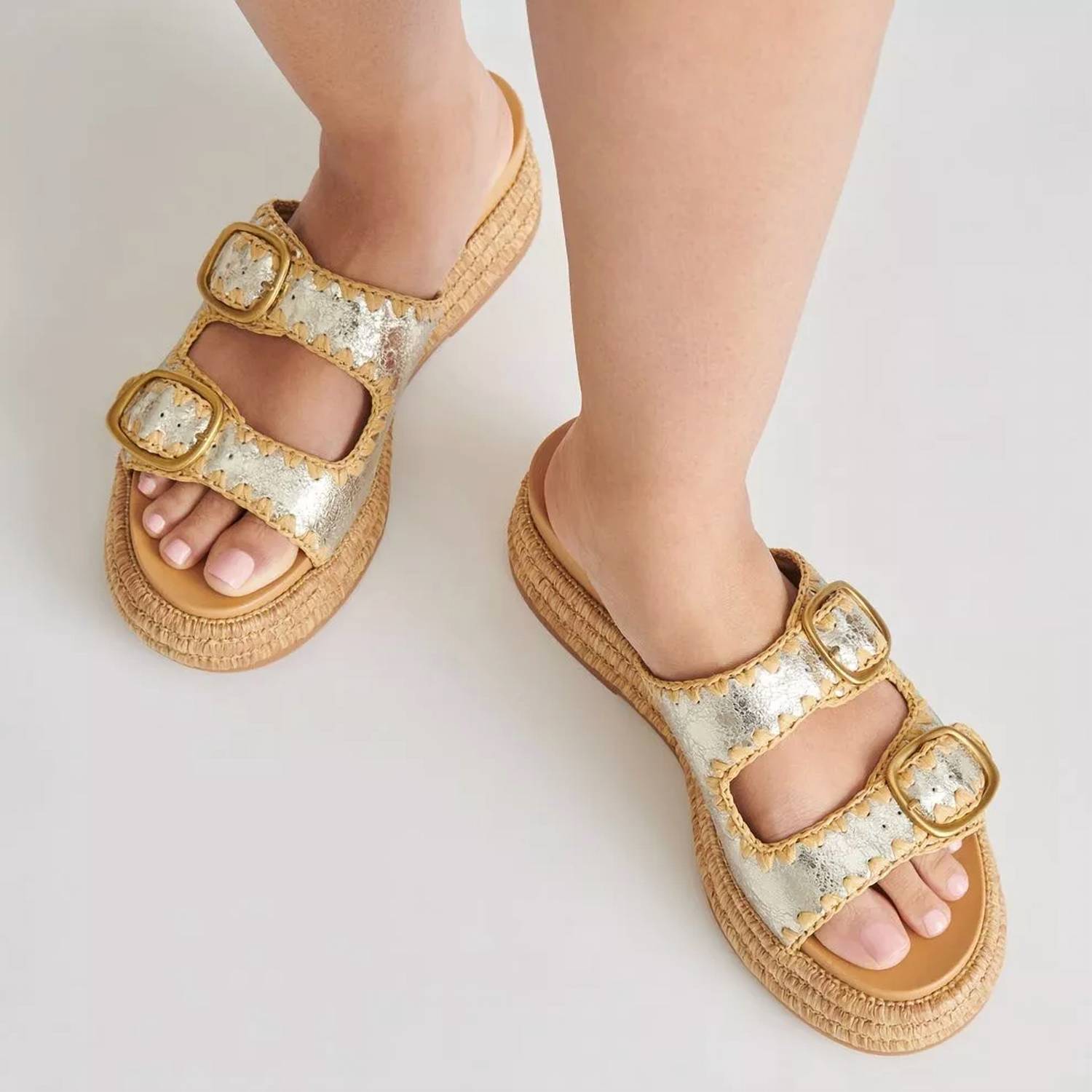 Clássico e fofo, perfeito para usar o dia todo. Adoramos esta sandália. Adote um estilo despojado com a Sandália Feminina Wanika da Dolce Vita, com um design boho-chic em ráfia e fivelas sofisticadas. Confeccionadas com cabedal em couro craquelado platinado, estas sandálias oferecem bico aberto e salto plataforma confortável de 3,8 cm para um toque de elegância. Material: Couro com solado de borracha e forro sintético tipo meia garantem durabilidade e conforto. Perfeitas tanto para resorts de praia quanto para passeios pela cidade.