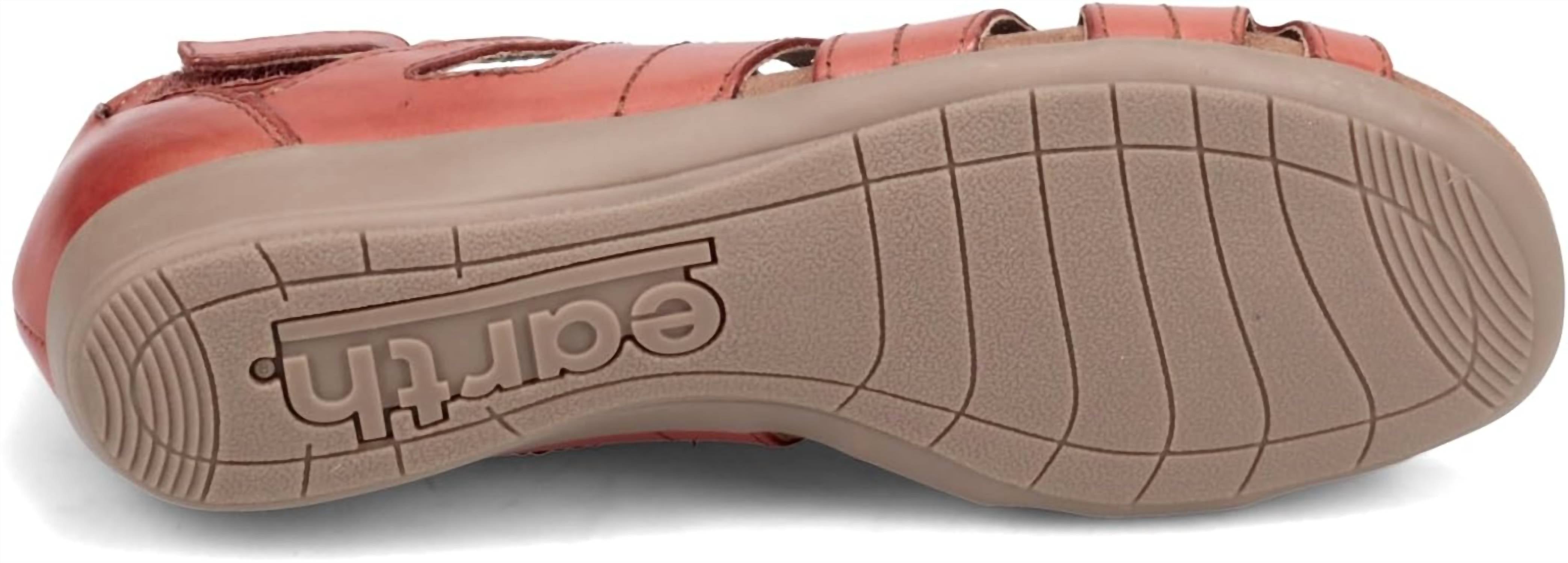 The Women's Belder Bea Sandal by Earth Origins in vibrant Ginger Spice is designed for ultimate comfort and support. This low heel, closed-back sandal boasts leather uppers sourced from a LWG Gold Rated tannery and features a secure bungee stretch lacing system. The cushioned Powerpath footbed, made with EVA foam, energizes every step, while the TPR outsole ensures durable, non-slip traction. Made from 100% leather with a moisture-wicking footbed cover created from 82% recycled plastic bottles, this sandal offers a sustainable touch for your summer wardrobe.