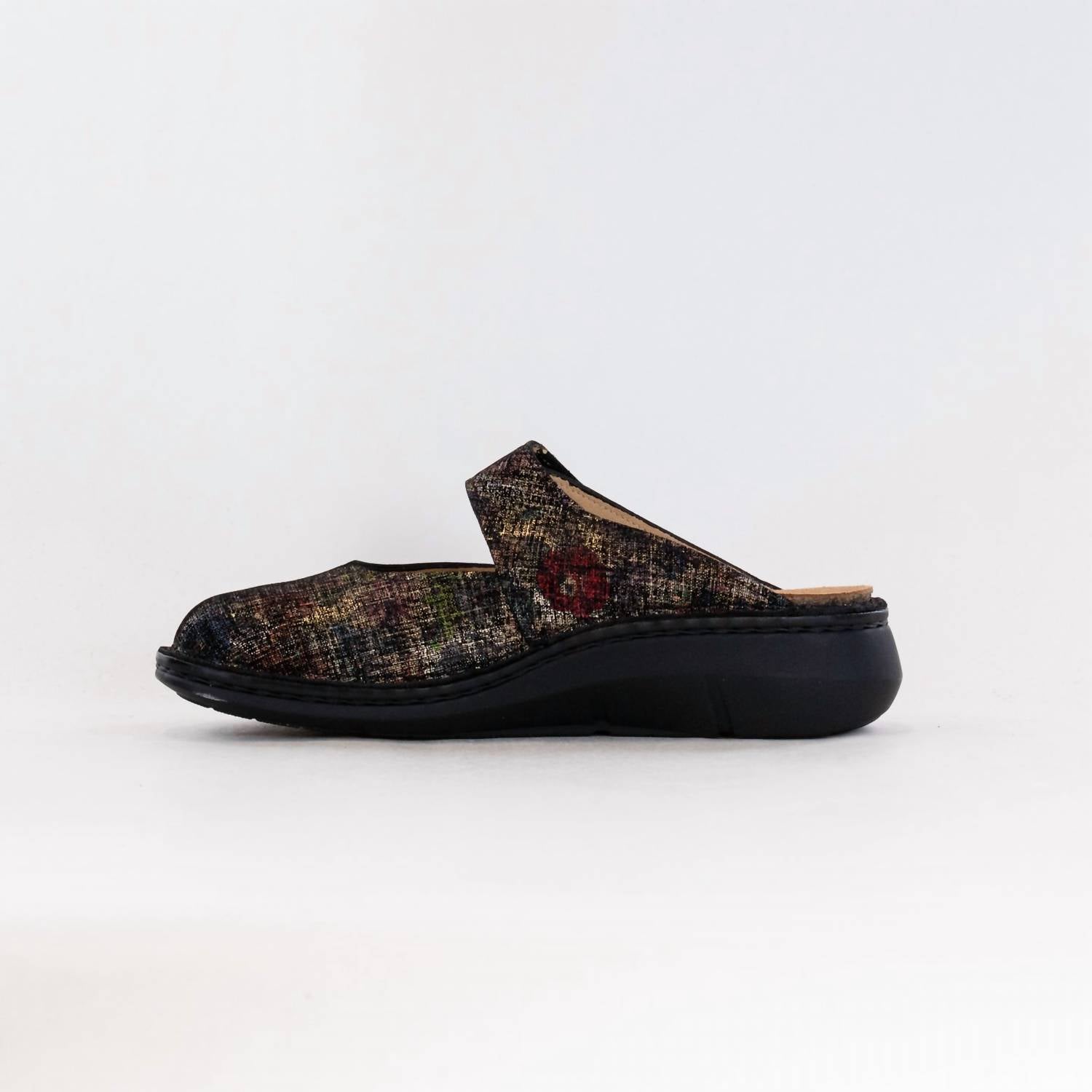 A trend that everyone is loving and this style might just be our favorite. Step into ultimate comfort and style with the Women's Roseau Sandal by Finn Comfort, a classic mule featuring a premium leather upper. This versatile clog in a vibrant Multi Brokat color includes an adjustable hook and loop strap for a customized fit. With a flexible PU outsole that is handstitched to the upper, and a removable footbed made of suede leather, jute, and cork, it promises superior comfort and support. Ideal for streetwear and travel occasions, it boasts a 25mm heel height, offering a standard to wide fit and a round toe shape perfect for spring adventures.