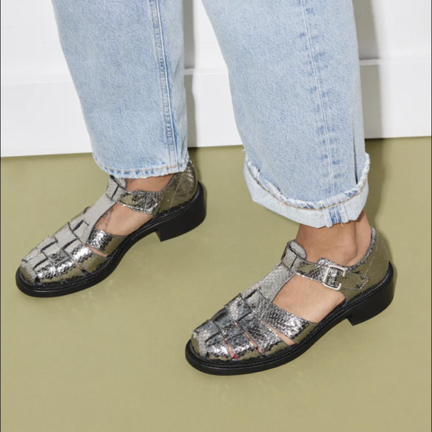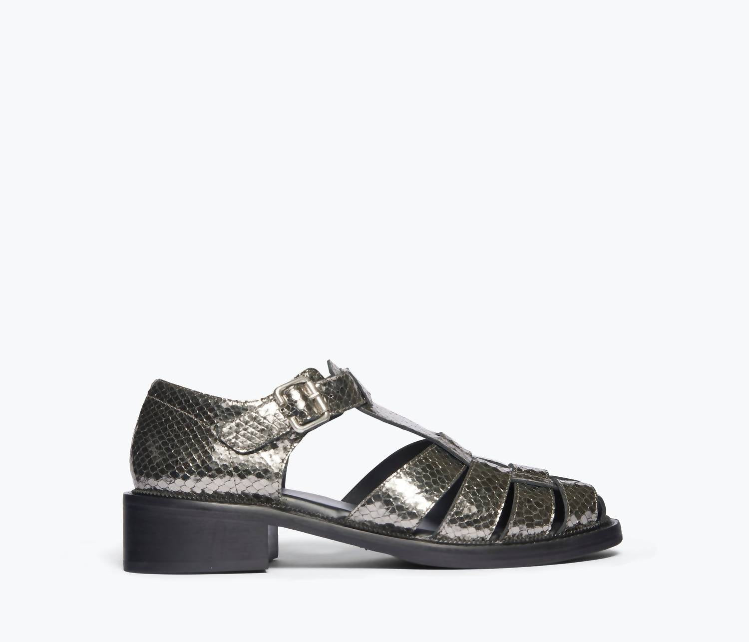 Entre no estilo com as Sandálias Femininas Dahlia da FREDA SALVADOR, uma escolha sofisticada para qualquer guarda-roupa moderno. Confeccionadas em couro 100% italiano com um impressionante design de cobra em relevo na cor antracite prateado, estas sandálias apresentam um salto bloco de couro de 4 cm para um toque elegante. O forro confortável em couro espanhol e o solado de couro durável, aprimorados com um spray de borracha, prometem durabilidade durante todo o dia. Com um design feminino com tira em T, estas sandálias combinam perfeitamente a elegância clássica com o toque contemporâneo.