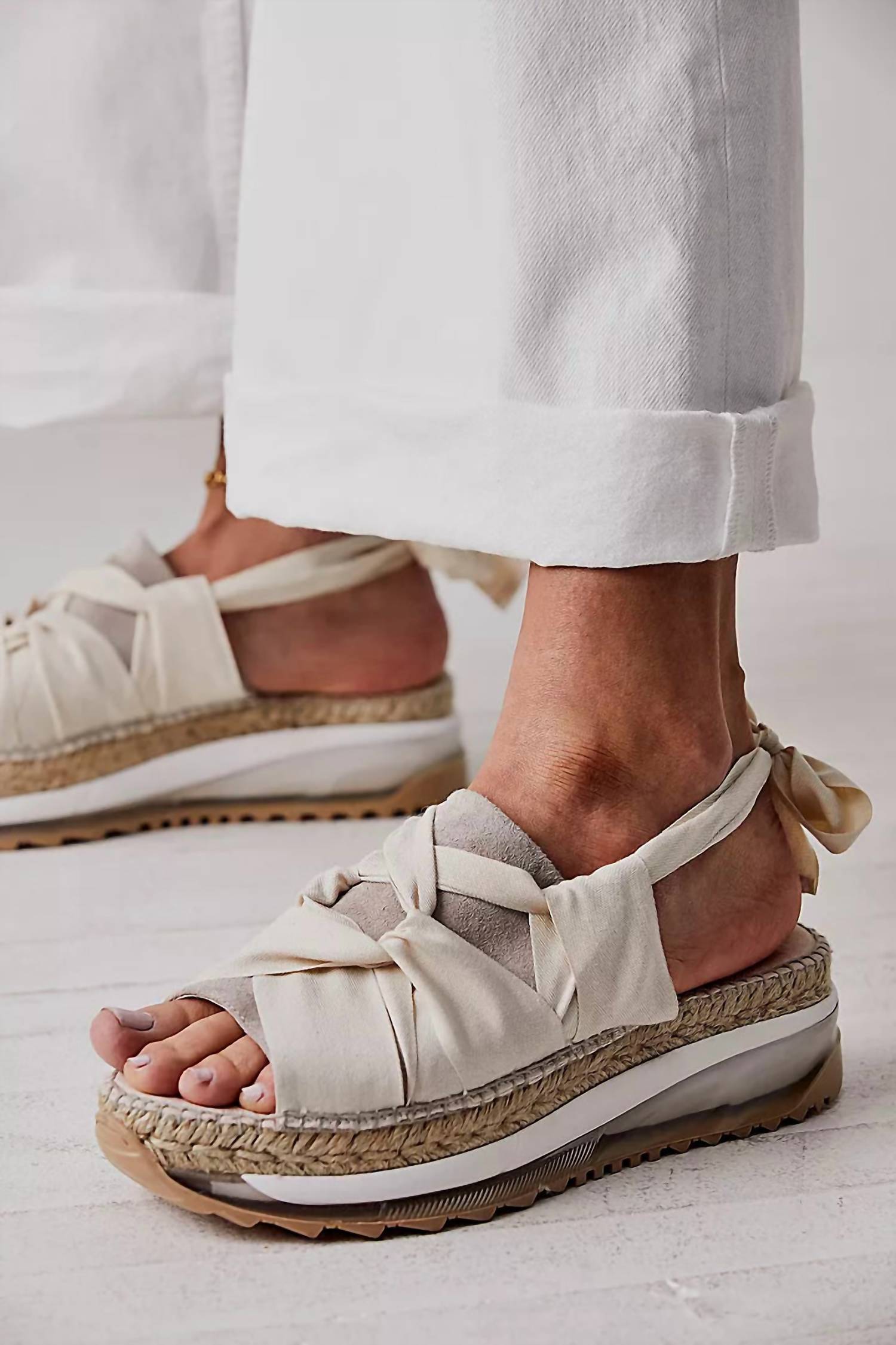 Classicly cute and all-day-wearable. We love this sandal. Step up your summer style with the Women's Chapmin Sport Sandals by Free People, a perfect blend of boho chic and sporty appeal. These mid-height wedge heels feature a stylish slingback design with suede toe straps and a round open toe for a feminine touch. Designed with a unique triple-stacked platform sole and espadrille detailing, they boast oversized ribbon laces that tie elegantly at the back. Slip-on these beige beauty sandals for your next vacation and enjoy the artisanal craftsmanship synonymous with FP Collection.