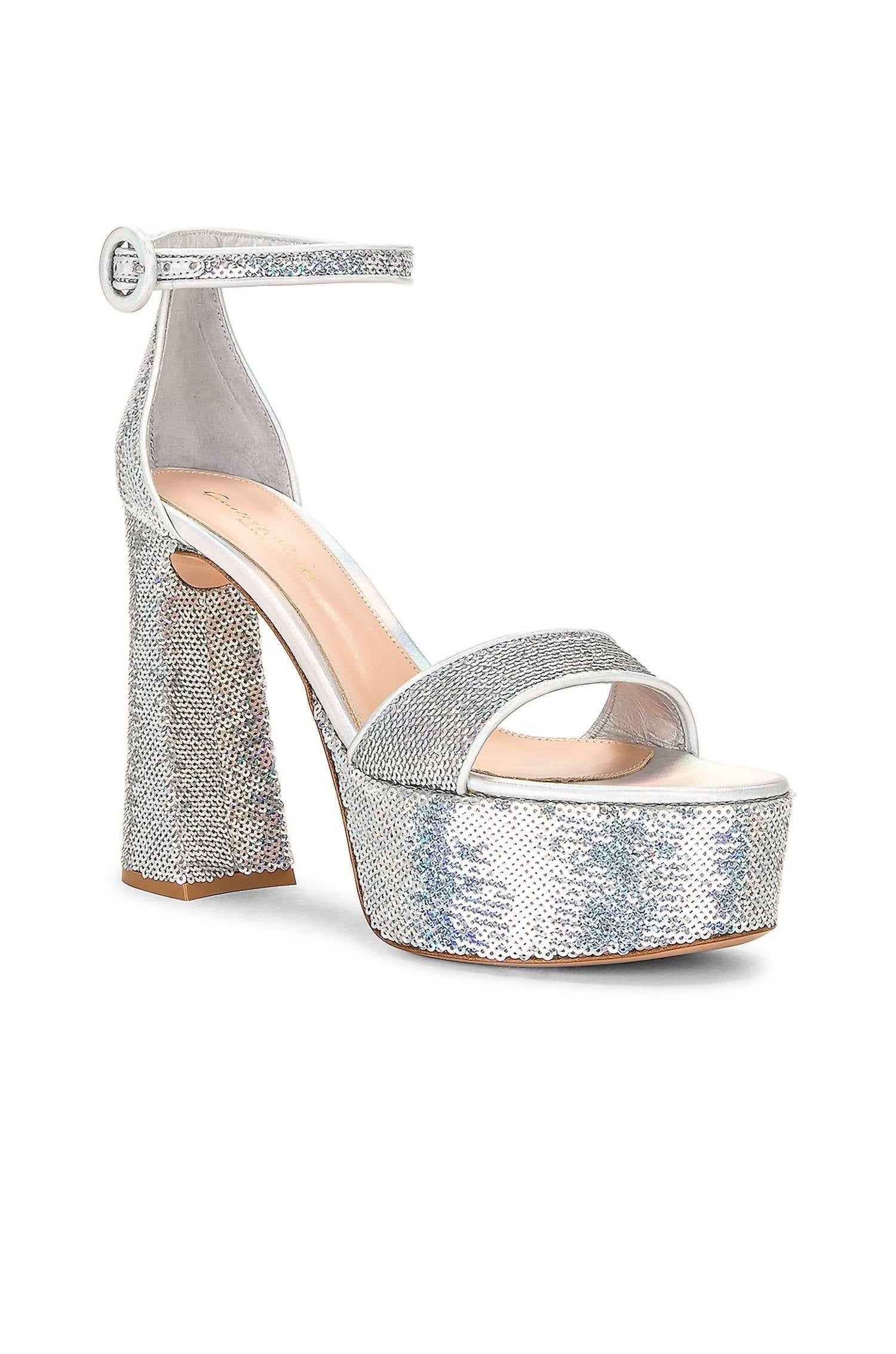 Entre em sintonia com a elegância com a Sandália Plataforma Feminina com Lantejoulas 70 da Gianvito Rossi, perfeita para adicionar brilho ao seu look. Confeccionada em 100% lantejoulas e 100% couro, esta sandália apresenta um impressionante tom prateado holográfico. Fabricada na Itália, apresenta um bico aberto sofisticado e um salto plataforma de altura média de 70 mm (aproximadamente 2,76 polegadas), proporcionando estilo e conforto. Estas sandálias seguem os tamanhos americanos, tornando-as a escolha ideal para a coleção Primavera 2023.