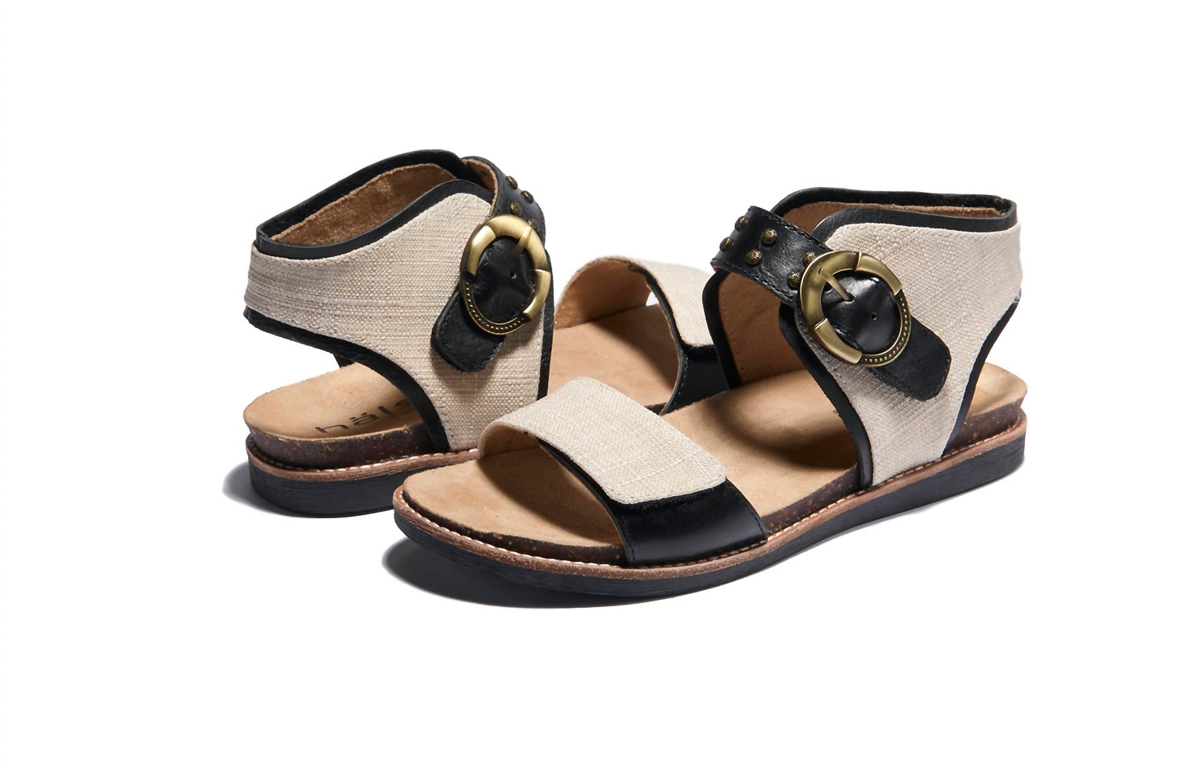 Entre no verão com a Sandália Feminina Bari da Halsa Footwear, uma combinação perfeita de couro e linho para um visual boho chic. Esta sandália possui tira ajustável no tornozelo com fecho de fivela e palmilha confortável de cortiça para uso o dia todo. Com cabedal em couro e tecido, forro em couro e solado de borracha, ela é projetada com tecnologia antimicrobiana para garantir conforto fresco e seco. Aposte no estilo importado e eleve seus looks de férias com este design de bico redondo e salto baixo em tons clássicos de preto e natural.