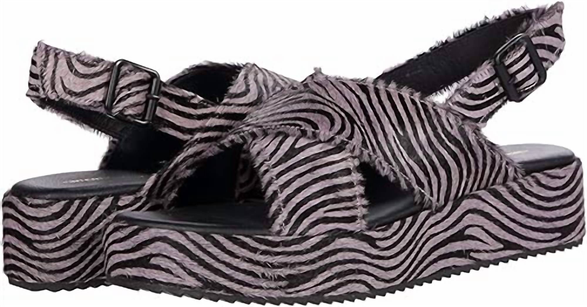 Clássico e fofo, perfeito para usar o dia todo. Adoramos esta sandália. Apresentamos as Sandálias Femininas Sum Lilac Zebra da INTENTIONALLY BLANK, uma adição ousada ao seu guarda-roupa de verão. Estas sandálias apresentam uma atraente estampa de zebra roxa e preta com tiras texturizadas cruzadas e um salto plataforma de 4 cm, perfeito para abraçar a moda dos anos 90 nas férias. A composição inclui cabedal em couro bovino e forro em couro. Desenhadas com bico aberto para um toque de estilo e conforto.
