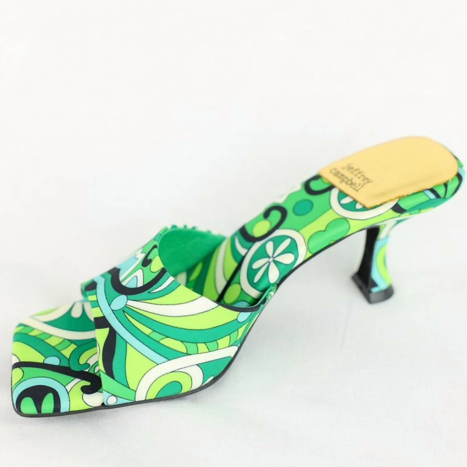 Sandália de salto quadrado com estampa divertida em verde psicodélico. Tamanho real com salto de 7,6 cm.