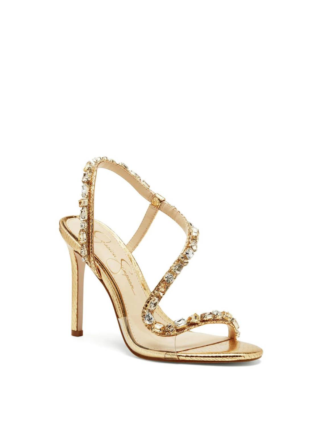 Detalhes em cristais brilhantes na tira. Design fino e envolvente. Salto alto e cônico de 9,6 cm. Material acetinado. Estilo slip-on. Importado.