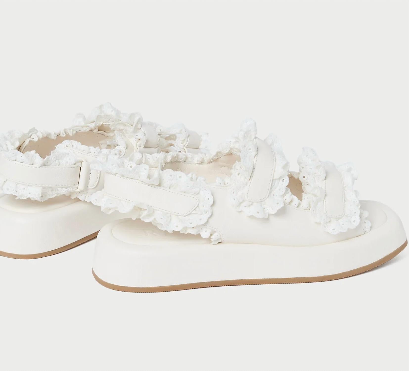Aposte no estilo sem esforço com a Sandália Plataforma Blaise Two Strap da Loeffler Randall, confeccionada em couro creme elegante com detalhe de cadarço com ilhós. Esta sandália aberta apresenta uma plataforma plana esportiva de 3,1 cm, perfeita para um toque de elegância. Projetada com foco no conforto, inclui palmilha acolchoada em couro e tira ajustável no calcanhar com fecho de velcro para um ajuste seguro. Importada para garantir a qualidade.