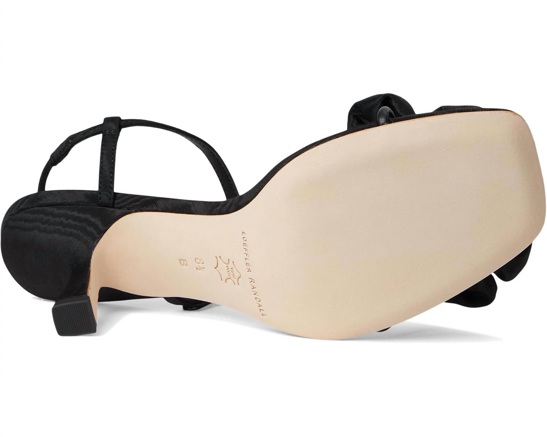 Flowy dresses, cropped pants, and even jumpsuits... this sandal works with them all! Elevate your style with the Women's Frank Flower Applique Heeled Sandals by Loeffler Randall, a stunning addition to any ensemble. These black moiré sandals boast a whimsical floral detail and a graceful strappy design with buckle closure for a secure fit. Crafted with a luxurious wool upper and lined with smooth leather, they feature a comfortable padded footbed with a gold-stamped logo. The 2.75-inch spool heel completes the look, making these sandals an ideal choice for dinner parties or summer celebrations. Imported.
