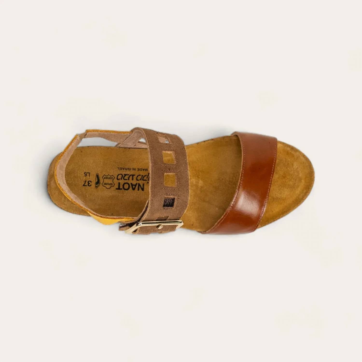 Use o dia todo com conforto e estilo com a sandália plataforma Dynasty. Esta sandália possui tiras coloridas divertidas e fecho de velcro para ajuste. A palmilha anatômica de cortiça e látex da Naot é revestida por uma camurça macia e se molda ao formato do pé com o uso.