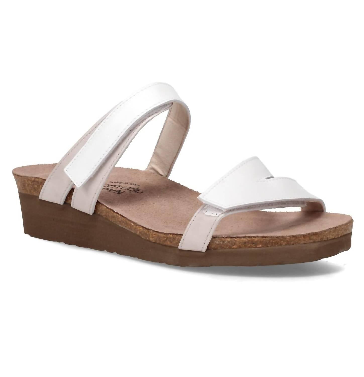 Clássico e fofo, perfeito para usar o dia todo. Adoramos esta sandália. Apresentamos a Sandália Feminina Presley da NAOT em um elegante Quartzo de Couro Branco Pérola, projetada para estilo versátil e conforto. Este chinelo aberto possui tiras duplas de velcro e salto plataforma de 3,8 cm, garantindo um ajuste perfeito ao tamanho, sendo recomendado um tamanho maior para quem usa meias-calças. Confeccionada com couro macio e forrada com palmilha anatômica de cortiça e látex, ela se molda aos seus pés para um conforto personalizado. O solado e o revestimento em EVA proporcionam facilidade de uso, tornando esta sandália um item essencial para o verão.
