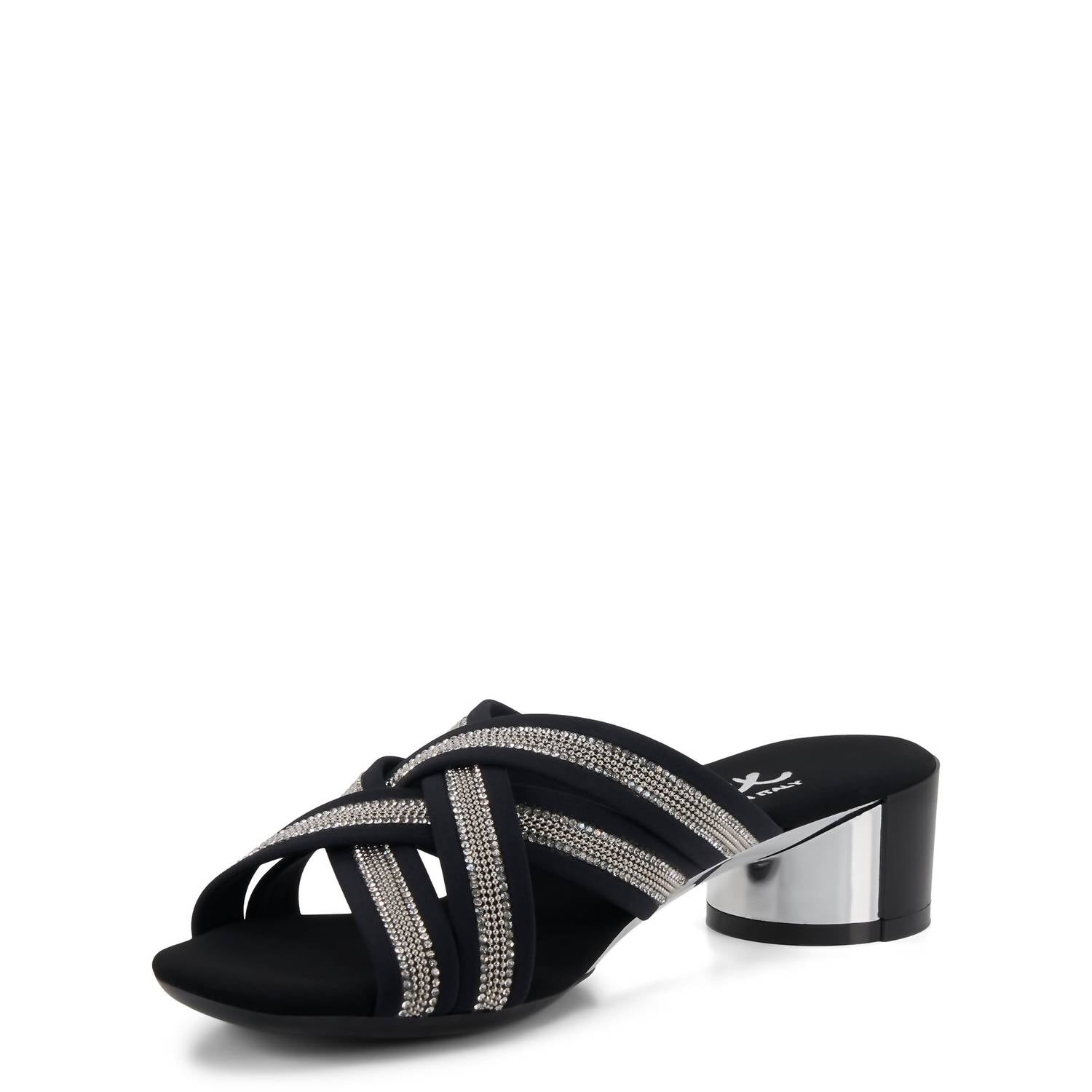 Esta sandália elegante e confortável é perfeita para a sua próxima saída à noite. Com tiras elásticas macias e cruzadas, adornadas com cristais, oferece um toque de brilho e garante um ajuste seguro. O design fácil de calçar é forrado com elástico macio para maior conforto, e o salto da mesma cor com um sutil detalhe metálico adiciona um acabamento elegante. A palmilha totalmente acolchoada mantém você protegida a noite toda.