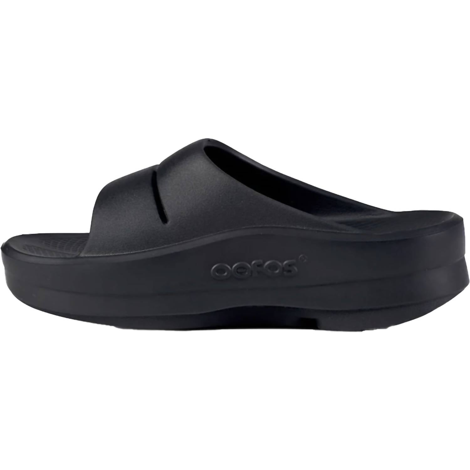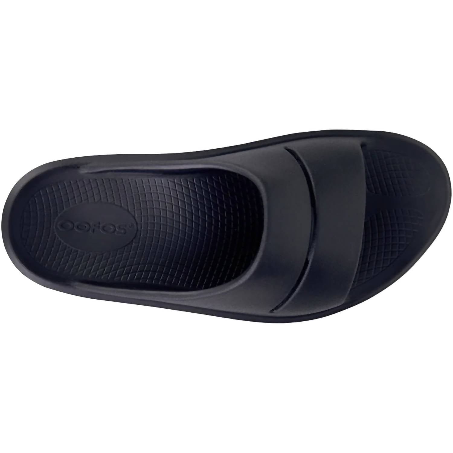 This sandal will take you from brunch to dinner and everything in between. Step into unparalleled comfort with OOFOS Women's Omega Sandal in classic black. Made from highly durable synthetic material, these slides embody a modern reinterpretation of the traditional OOahh sandals, perfect for both casual and active recovery. Featuring OOfoam technology, the patented footbed design absorbs 37% more impact, significantly reducing stress on the knees, ankles, and other joints. Ideal for vacation or streetwear during summer, these sandals are machine washable for easy care and designed to minimize odor, boasting a chunky heel and round toe for added style.