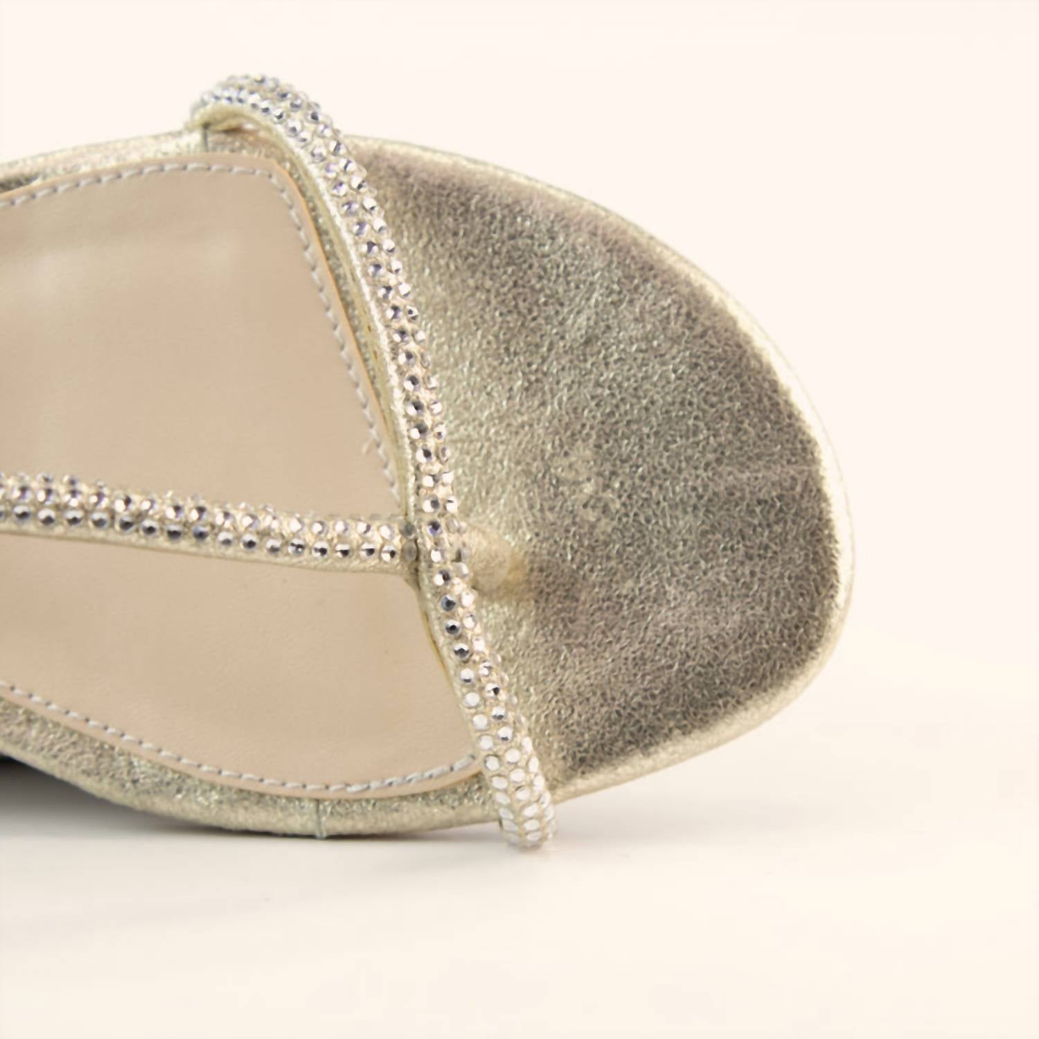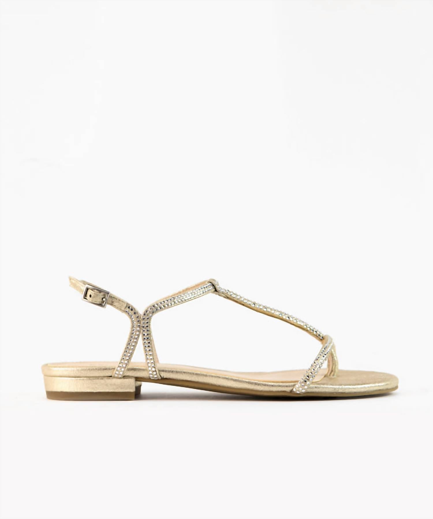 Eleve seu guarda-roupa para o clima quente com a Sandália Barber Feminina da Pelle Moda, uma peça de destaque em camurça brilhante adornada com joias de strass. Esta sandália é confeccionada com um design aberto nos dedos e um salto plano confortável, disponível em um tom dourado radiante. Fechamento: Fivela ajustável. Perfeita para a transição do dia para a noite com um toque moderno e contemporâneo.