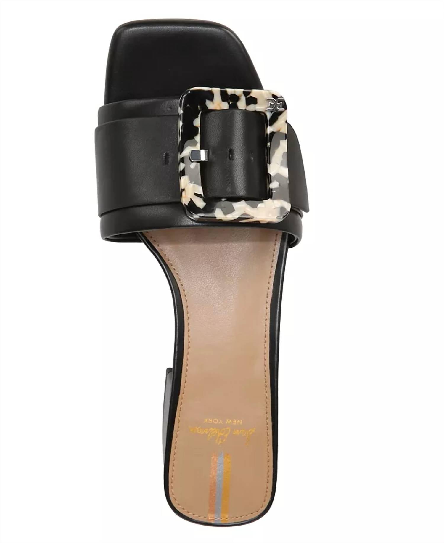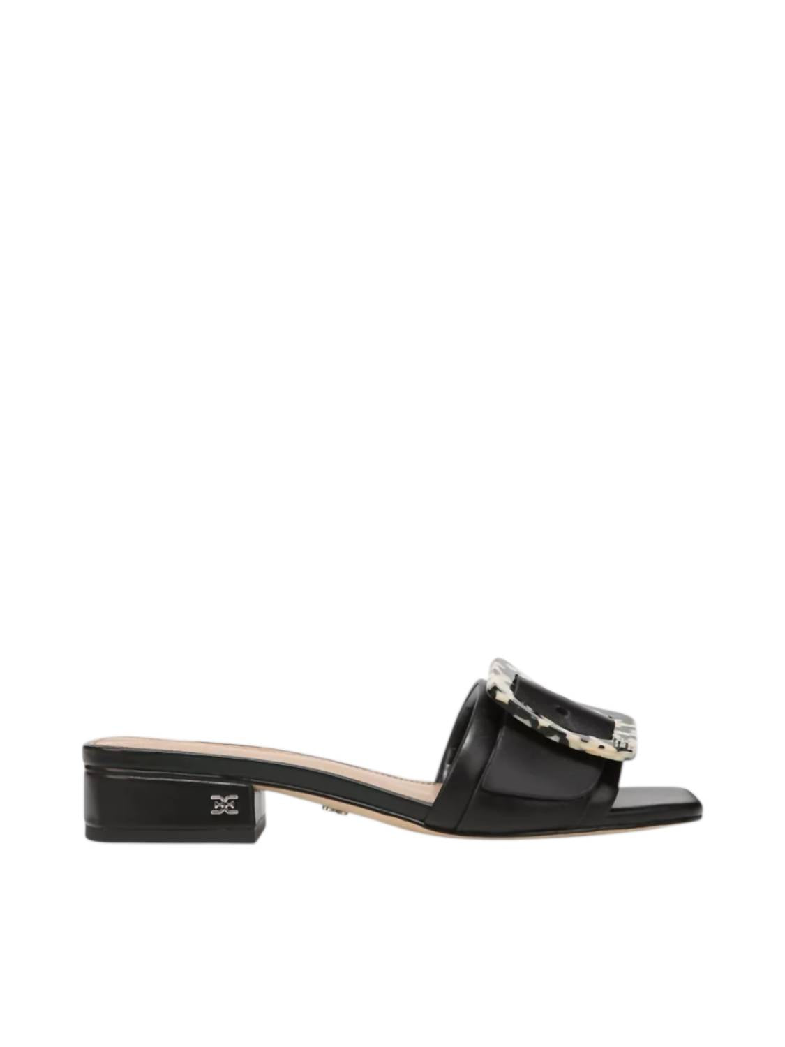 Conheça a sandália feminina Deacon Slide da Sam Edelman, um par chique perfeito para o seu guarda-roupa de verão. Estas sandálias pretas apresentam um prático fecho slip-on e são confeccionadas em couro de qualidade com palmilhas sintéticas para maior conforto. Com um salto bloco modesto de 2,5 cm e um bico quadrado estiloso, elas combinam estilo e praticidade com perfeição. Os detalhes de fivela oversized adicionam um toque de sofisticação, tornando-as a escolha ideal para férias ou uma ocasião mais formal.