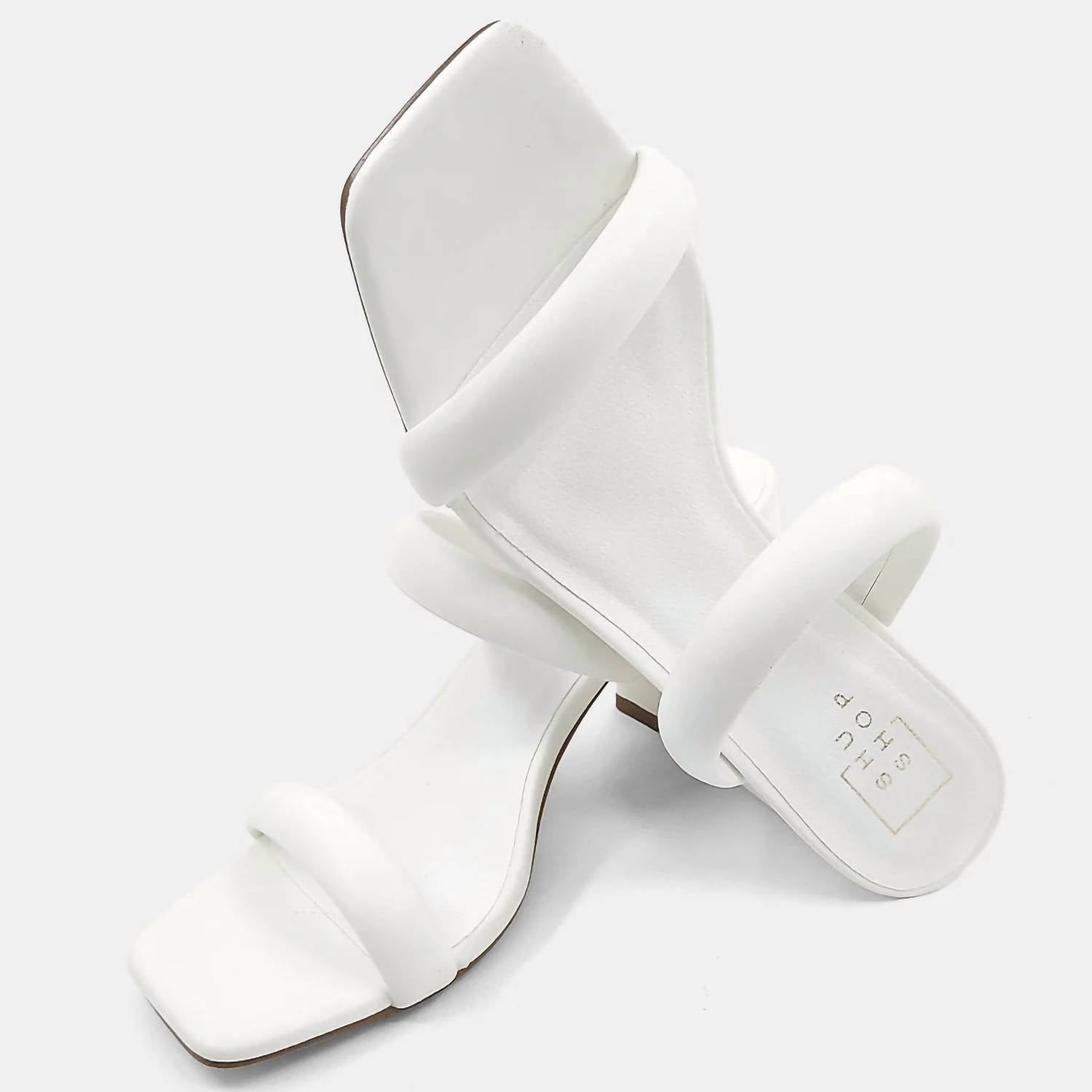 Introducing the Women's Farah Sandal by SHU SHOP, a chic addition to your spring wardrobe. Featuring cushioned straps and a comfortable, versatile mid-height block heel, these sandals are perfect for various occasions. With an elegant open toe design and a minimalist trend, they're ideal for pairing with both casual jeans and stylish dresses. Elevate your vacation look with this stylish white sandal that's designed for medium width.