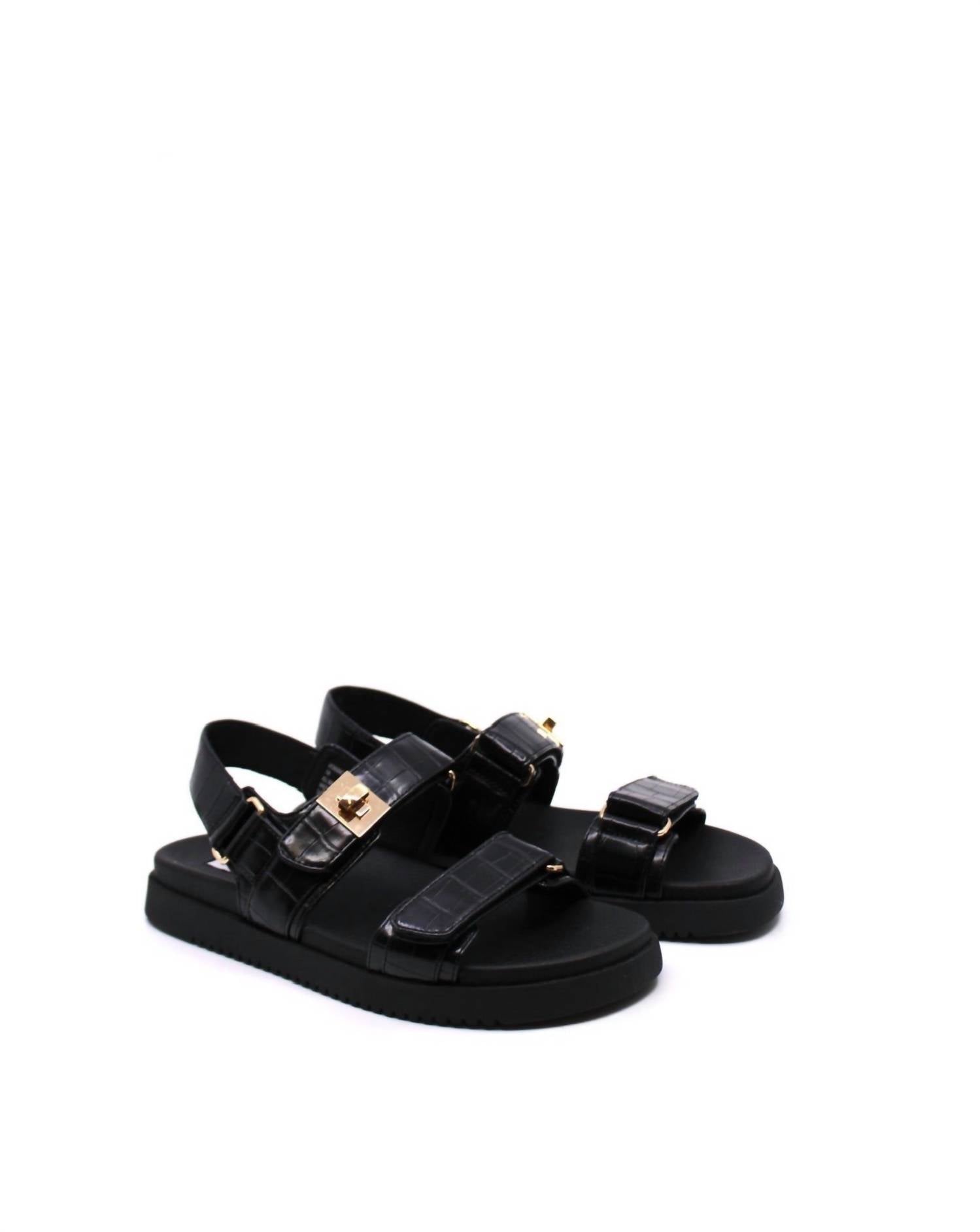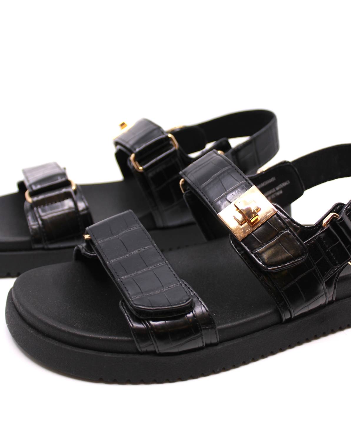 Com palmilha moldada e solado plano, o design de couro com três tiras também ostenta ferragens douradas. Fecho ajustável em velcro na tira frontal. Salto de 2,5 cm.