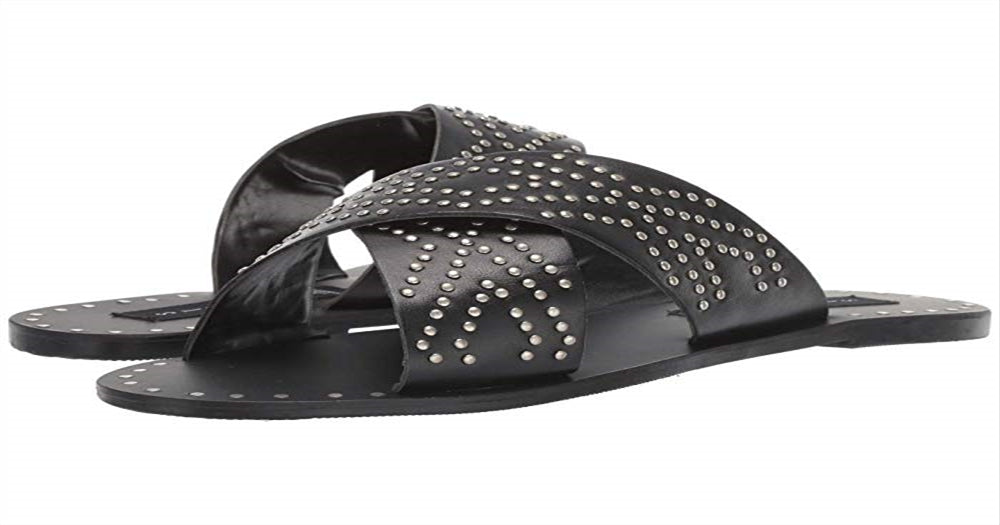 As tiras cruzadas com tachas exibem um toque de padrões geométricos no design discreto das sandálias femininas da STEVEN NEW YORK. | Salto 1/2 | Sandálias cruzadas com bico redondo e tachas | Design com tachas nas tiras | Cabedal em couro; forro sintético; sola de borracha | Importado
