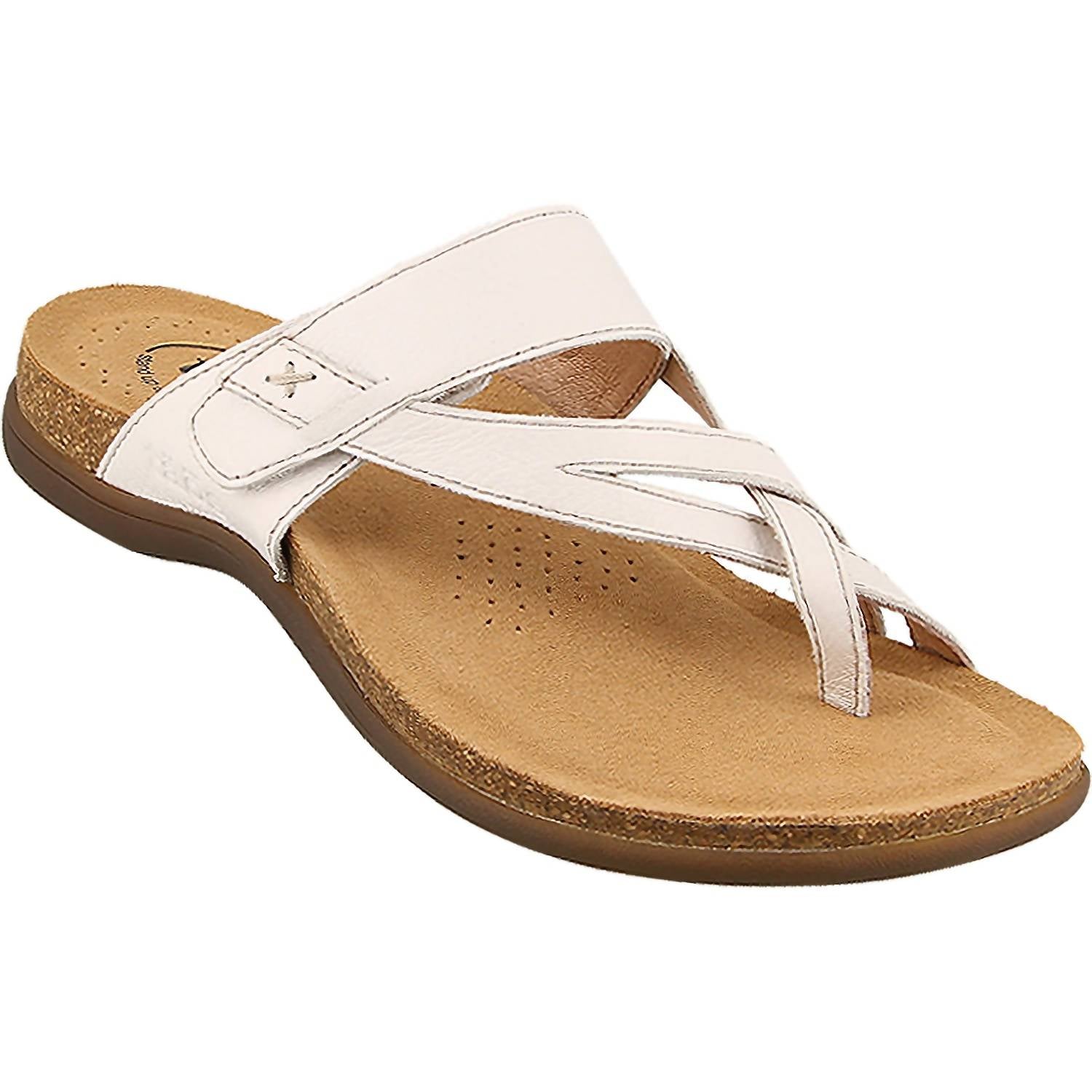 Flowy dresses, cropped pants, and even jumpsuits... this sandal works with them all! Step into all-day comfort with the Taos Perfect Leather Casual Sandals, ideal for any summer adventure. These stylish white leather thong sandals feature an adjustable strap and a premium microfiber footbed lining for ultimate softness. Enhanced with arch and metatarsal support, the molded, contoured polyurethane insole is covered with Cool Recovery Foam, while the flexible rubber outsole ensures durability. With a heel height of 0.75 inches, these sandals boast a convenient hook and loop closure, offering the perfect fit for every step.