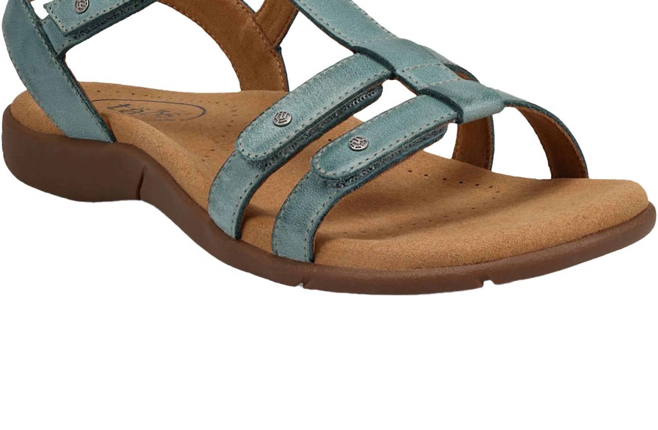Introducing the Taos Women's Trophy 2 Sandal, a chic option for summer getaways in a vibrant teal hue. Crafted from smooth leather, this sandal features an open toe design and three adjustable hook and loop straps, ensuring a comfortable fit. The premium footbed is equipped with Cool Recovery Foam, arch support, forefoot cushioning, and metatarsal support for all-day comfort. A flexible and durable rubber outsole supports a flat heel height of 1 inch.