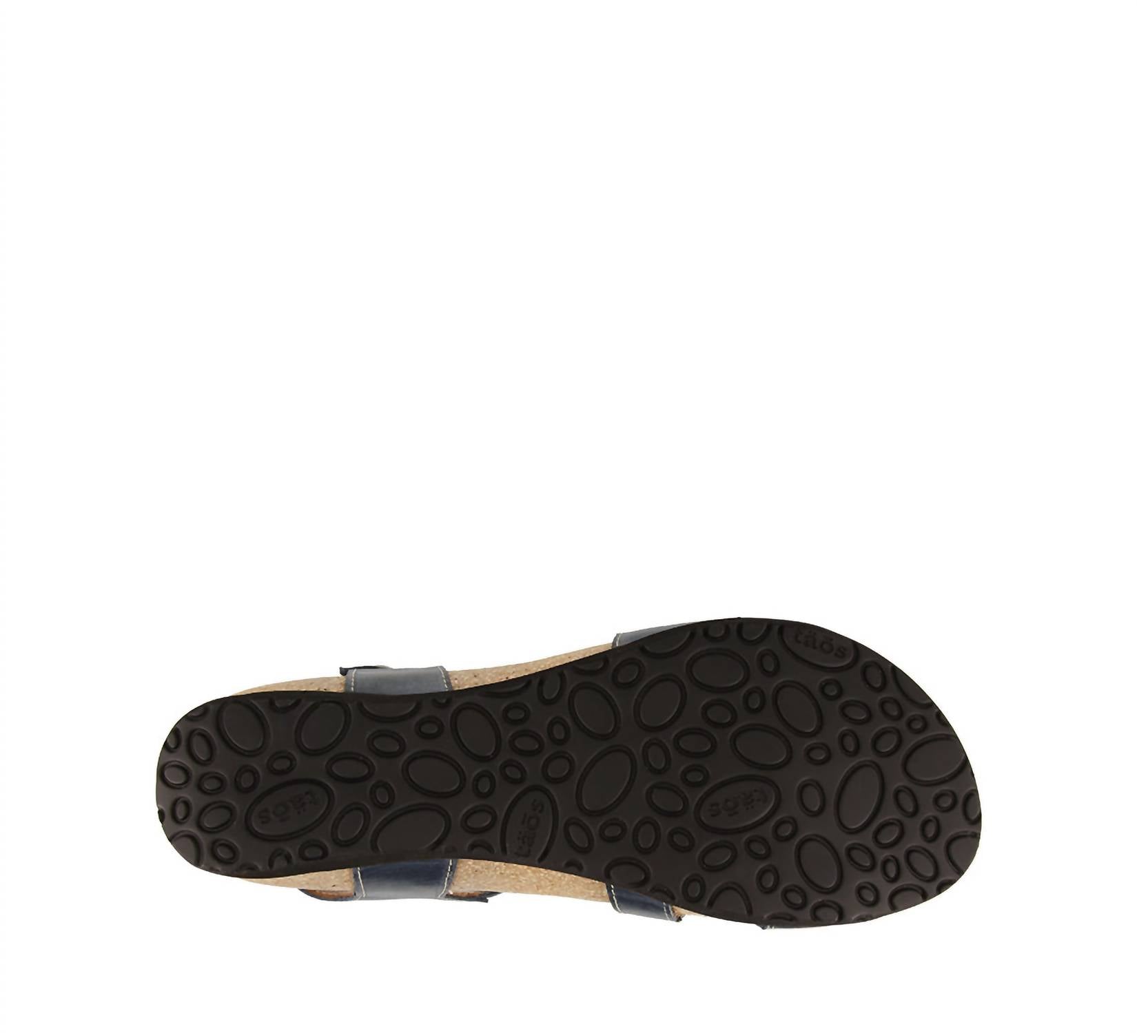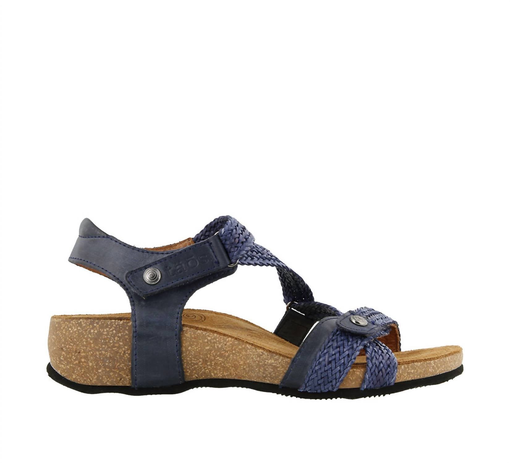 Step into style and comfort with the Women's Trulie Leather Sandals by Taos, crafted in Spain in a rich navy hue inspired by the Spanish sea and sky. These sandals feature a leather upper and lining, with a round toe and a convenient hook and loop closure for a perfect fit. Resting on a 1.75" wedge heel, the contour cork-polyurethane footbed and suede lining ensure unparalleled cushioning and support. Care for these sandals by buffing with leather cleaner or polish and wiping with a dry cloth. Each shoe weighs a mere 7.2 oz, making them perfect for travel and embracing 90s fashion trends.