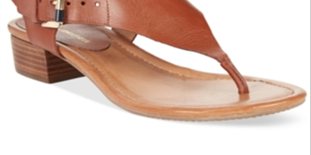 O salto bloco confere a este modelo um charme especial para os pés. Sandálias Kitty da Tommy Hilfiger. | Salto alto 1-1/4 | Sandálias redondas abertas com fecho de fivela | Cabedal sintético; sola sintética | Importado