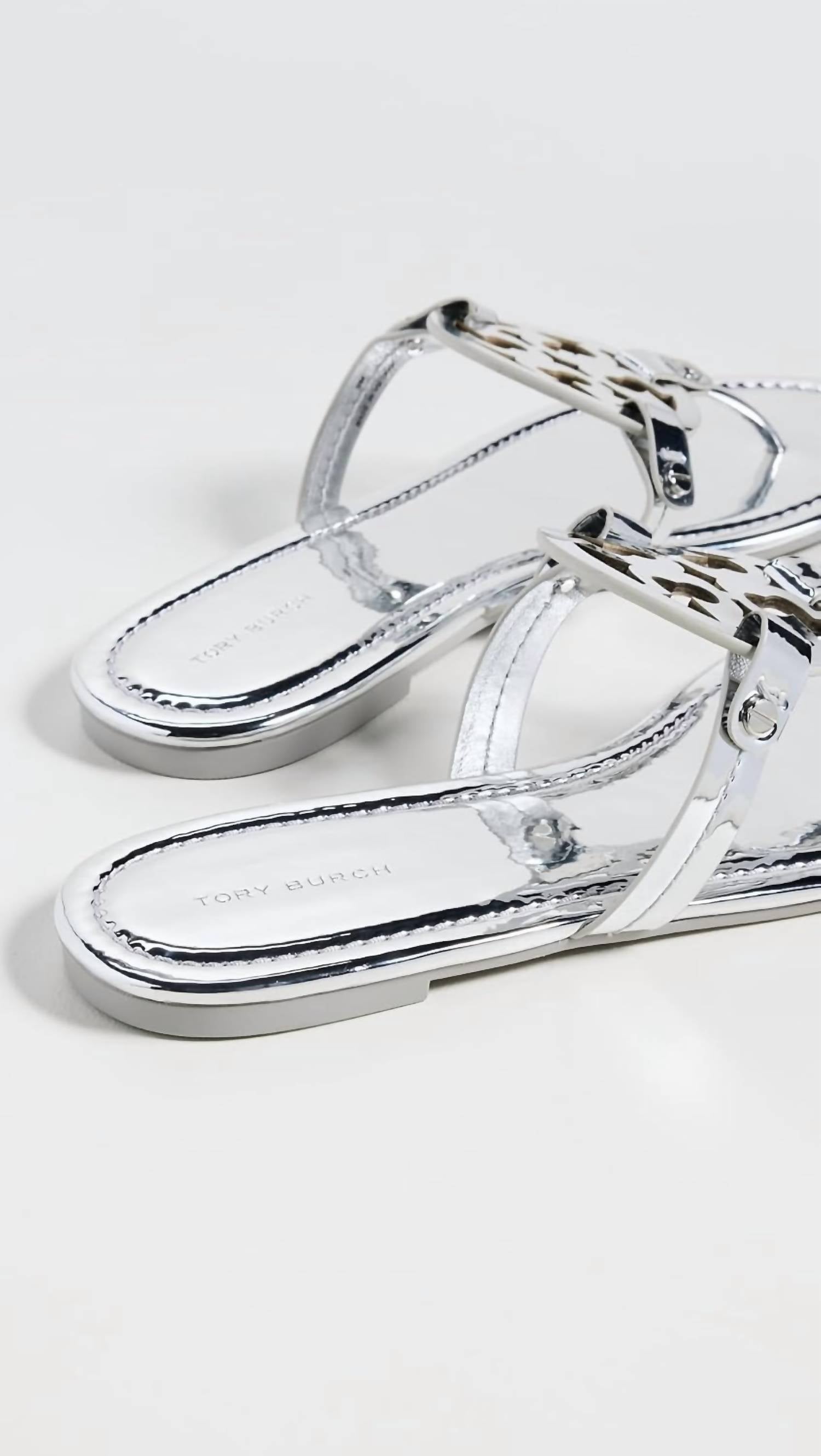 Vestidos esvoaçantes, calças cropped e até macacões... esta sandália combina com todos eles! Entre no estilo com as sandálias femininas Argento Miller Logo Slides da Tory Burch, a escolha ideal para um look chique de verão. Estas sandálias apresentam um design confortável de bico aberto com um elegante acabamento metálico espelhado, complementado por uma tira tipo tira fina adornada com um logotipo marcante. A construção inclui borracha durável tanto na sola quanto no material externo, garantindo um uso duradouro. Com um fecho prático e salto plano de 2,5 cm ou menos, estas sandálias importadas são perfeitas para um dia descontraído na praia ou um passeio pela cidade.