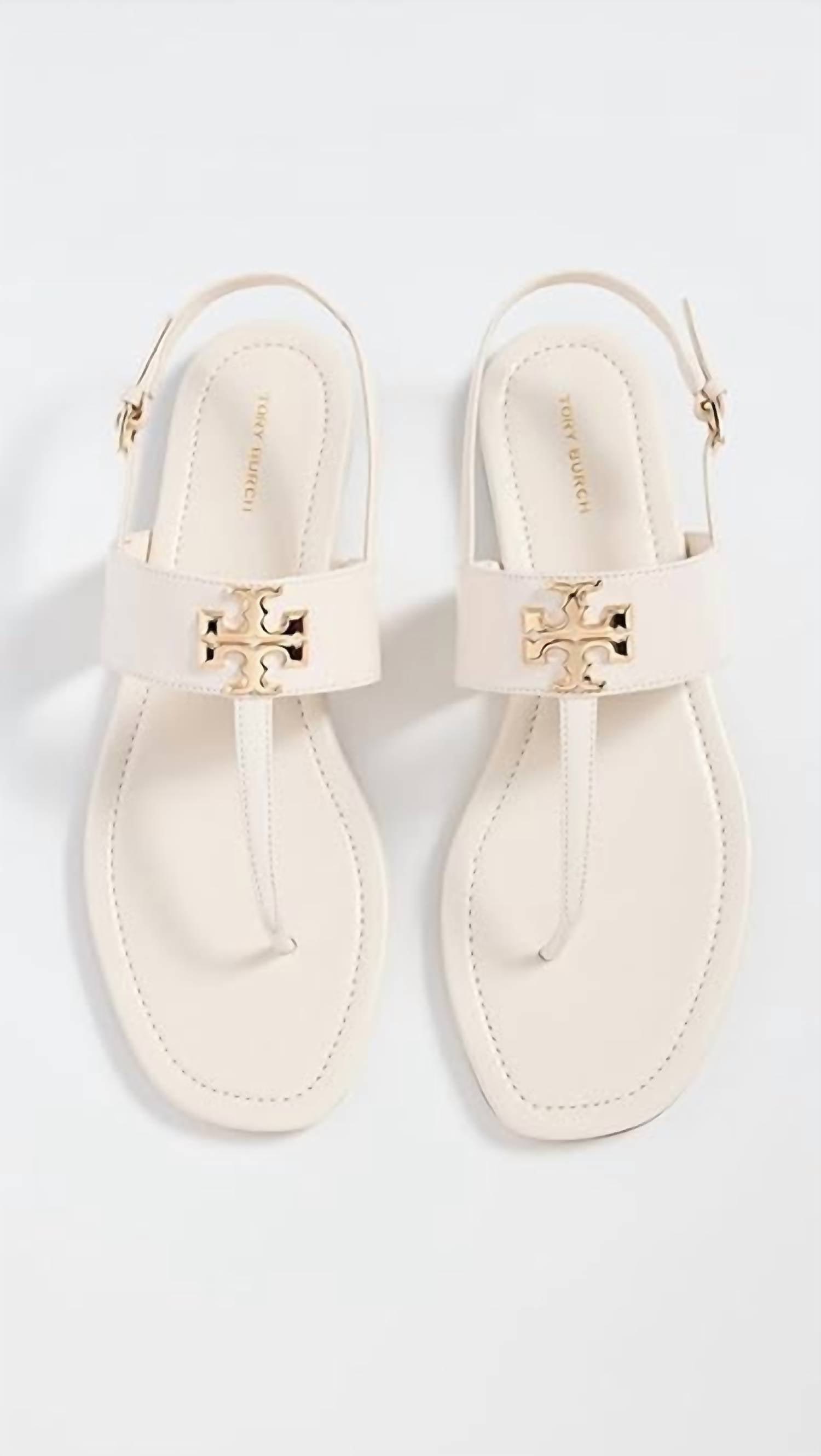 Clássico e fofo, perfeito para usar o dia todo. Adoramos esta sandália. Aposte no estilo sem esforço com as sandálias femininas Eleanor Thong da TORY BURCH, confeccionadas em couro off-white luxuoso para o verão. Estas sandálias slip-on estilosas apresentam um solado de couro elegante com um remendo de borracha para maior durabilidade e um salto plano, perfeito para qualquer ocasião de viagem ou streetwear. O logotipo dourado e a tira com fivela no tornozelo elevam o design, combinando praticidade com uma estética vanguardista. Feitas com carinho no Brasil, elas personificam a elegância versátil da estação.