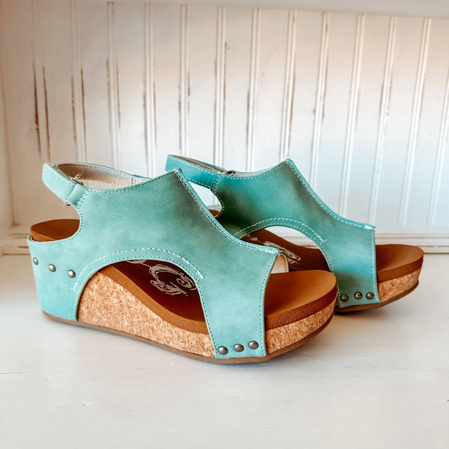 Classicly cute and all-day-wearable. We love this sandal. Step into style with the Isabella Wedge Sandal by Very G, an eye-catching turquoise addition to your wardrobe. These sandals boast a comfortable wedge heel with a cork bottom and a round toe shape. Enjoy the ease of a Velcro adjusting strap and 1/2" of padding for all-day comfort. Crafted from man-made materials, these sandals fit true to size for a perfect fit.