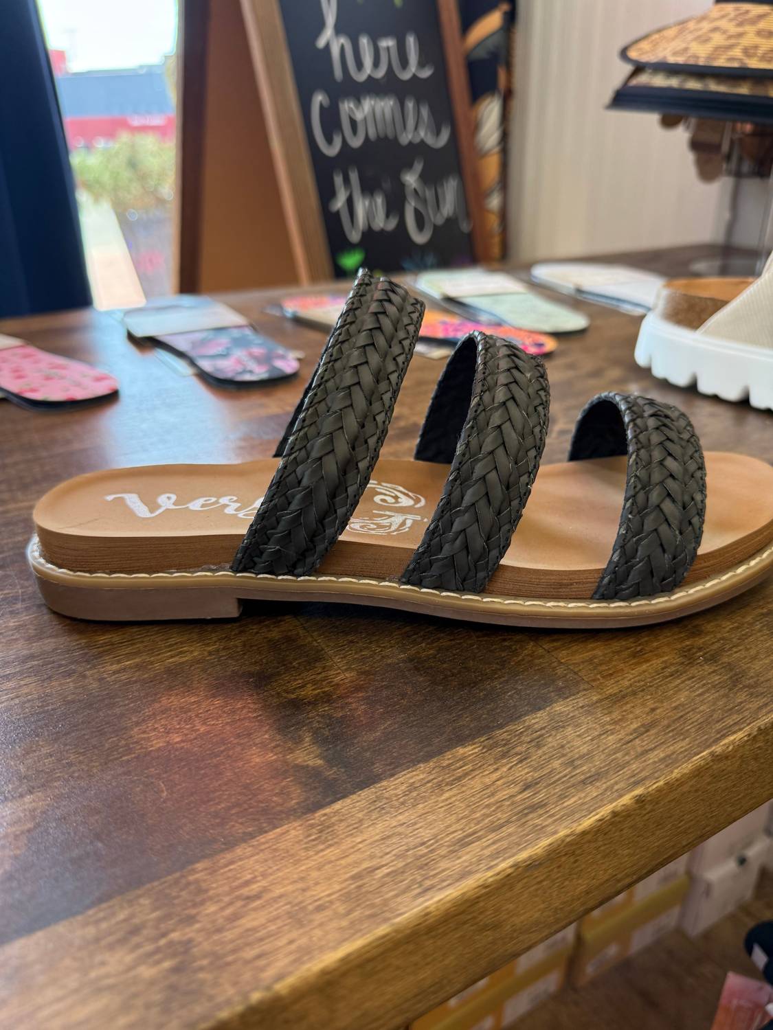 Classicly cute and all-day-wearable. We love this sandal. Introducing the Women's Alba 3-strap Braided Sandal by Very G, a minimalist black sandal perfect for summer vacations and Thanksgiving gatherings. Designed with an open toe and medium shoe width, it features three braided straps crafted from durable PU leather. The flat heel provides a low and comfortable lift with a soft memory foam footbed ensuring a true-to-size fit. Perfect for any occasion, this versatile sandal offers both style and comfort for adults seeking a chic yet relaxed look.