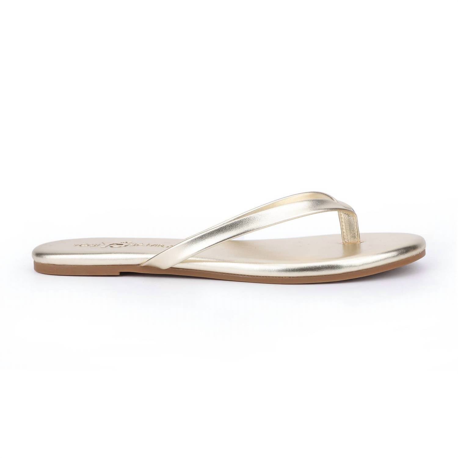 Vestidos esvoaçantes, calças cropped e até macacões... esta sandália combina com todos eles! Entre na elegância do verão com a Sandália Feminina Rivington Flip Flop da Yosi Samra, uma combinação perfeita de estilo e conforto. Confeccionadas em couro envernizado vegano com design aberto nos dedos, estas sandálias metálicas douradas prometem um toque boho chic, perfeitas para qualquer jantar. A palmilha e a entressola em espuma viscoelástica proporcionam amortecimento e suporte adicionais, enquanto o solado de borracha personalizado apresenta o design exclusivo de estampa de cobra. Importadas e disponíveis apenas em tamanhos inteiros, recomenda-se um tamanho maior se você usar meio tamanho.