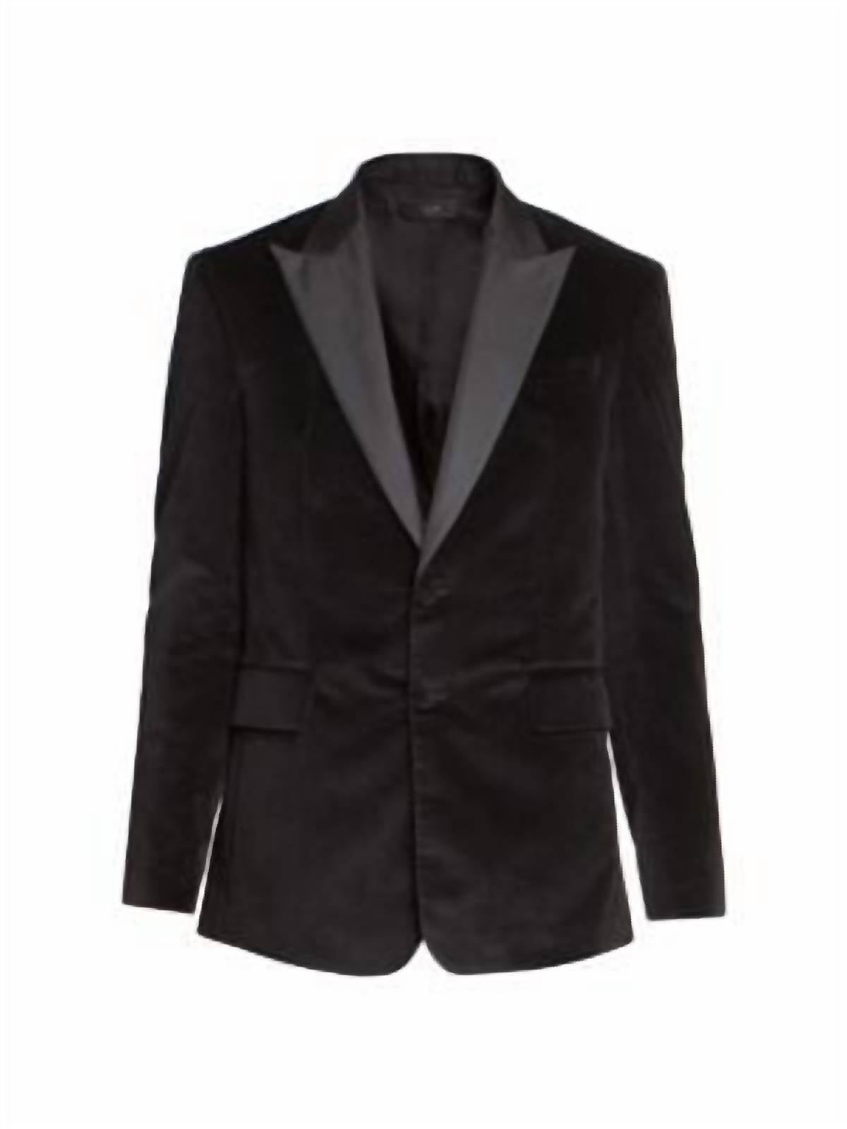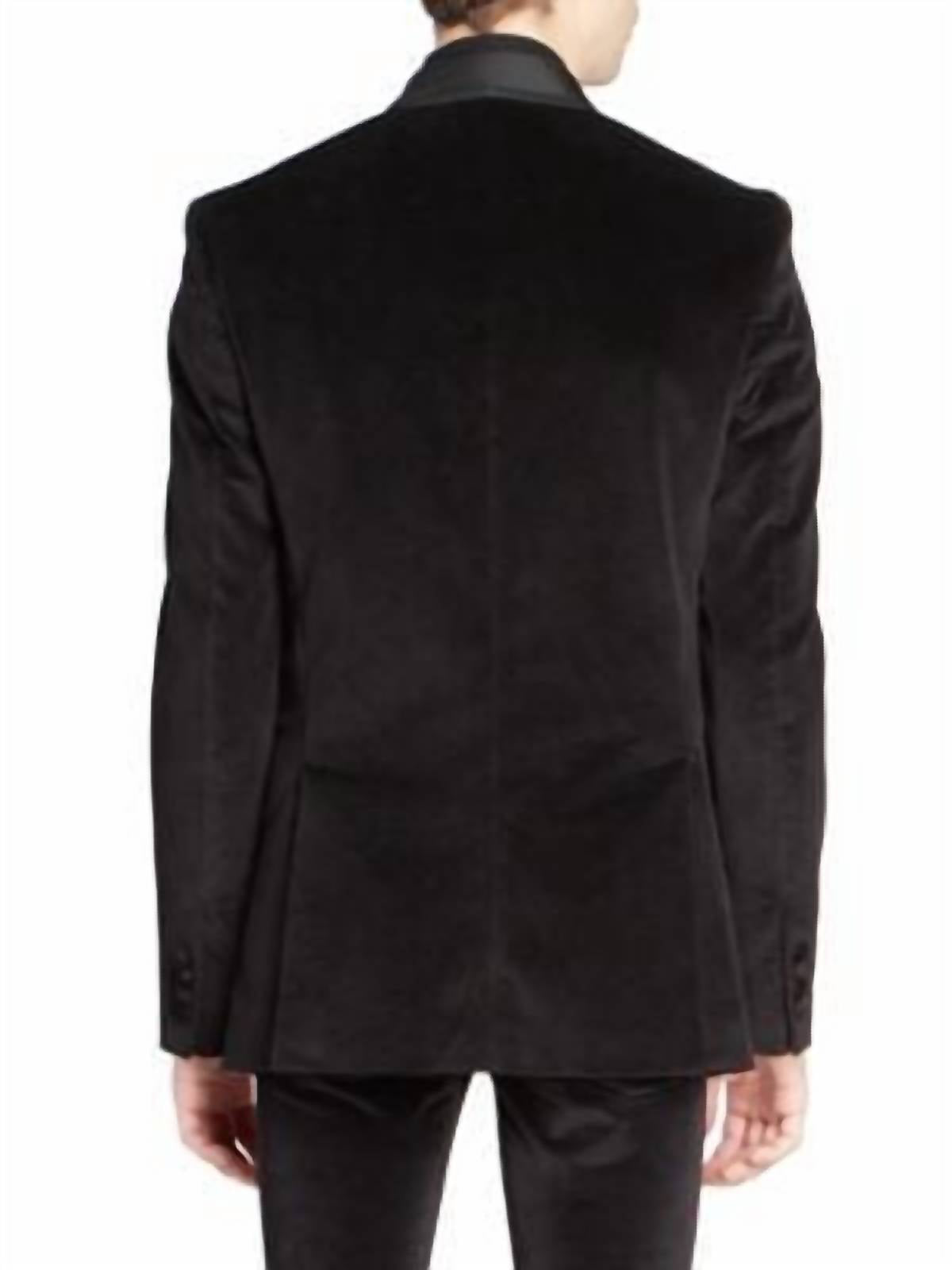 Introducing the Velvet Blazer Sport Coat by Amiri, a sophisticated choice for evening events or workwear. This chic men's blazer features long sleeves and a solid pattern in classic black. Crafted from a cotton blend, it combines 40% cotton with polyester, silk, and modal for a luxurious feel. Closure: Button closure. Care: Dry clean only. Perfect for fall occasions such as Thanksgiving.
