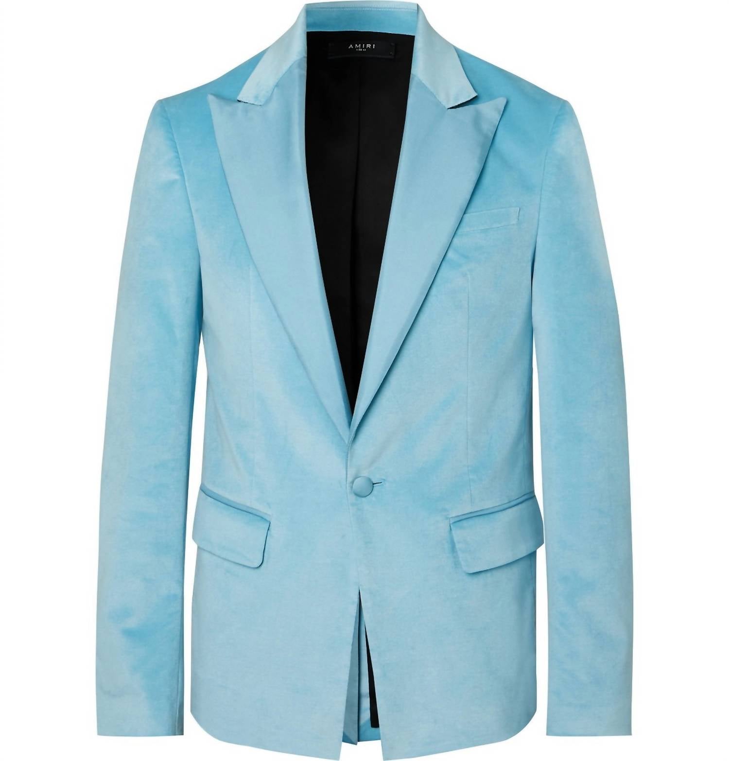 Elevate your evening ensemble with the Amiri Velvet Blazer Sport Coat in a sophisticated light blue hue. This men's sport coat features long sleeves and a solid pattern, making it a perfect choice for streetwear enthusiasts looking to make a statement at Thanksgiving events. Crafted from a cotton blend composition of 40% cotton, 25% polyester, 20% silk, and 15% modal, this blazer offers both comfort and elegance. It includes a button closure and pockets, and should be cared for with dry cleaning.
