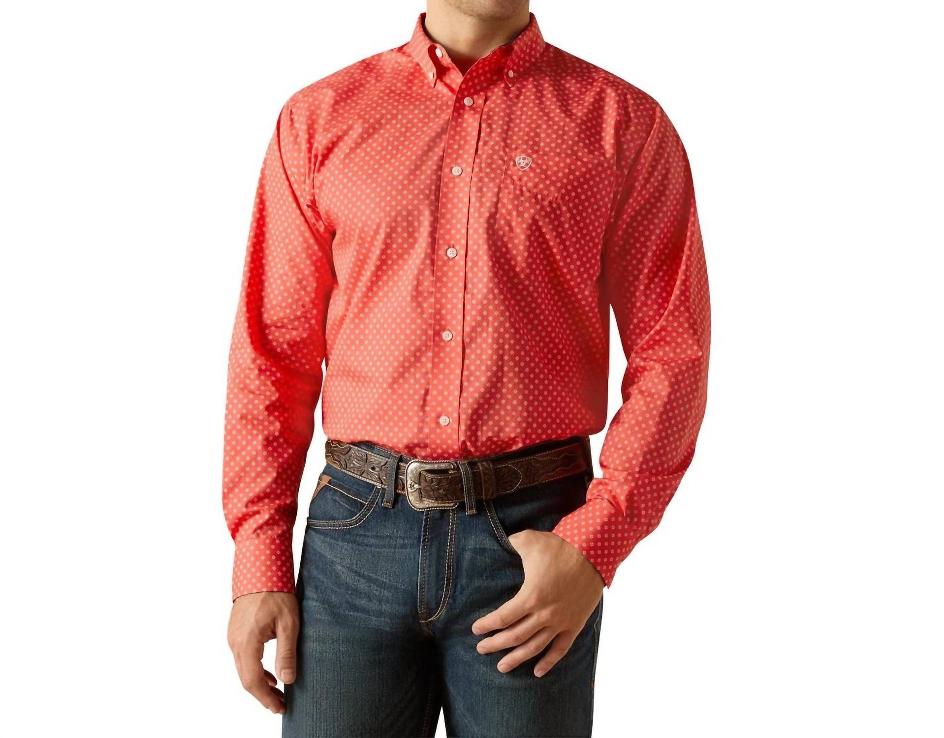 Experience effortless elegance with the ARIAT Wrinkle Free Wilkie Classic Fit Shirt in vibrant Cayenne. Designed for women, this long-sleeve shirt offers a classic button-down closure and is crafted from 100% cotton with a wrinkle-free finish, making it perfect for evening events or casual wear. Features include contrast collar band and cuffs, an open chest pocket, and extra length for tucking, ensuring maximum freedom of movement. Care for this imported piece with hand washing instructions to maintain its polished look.