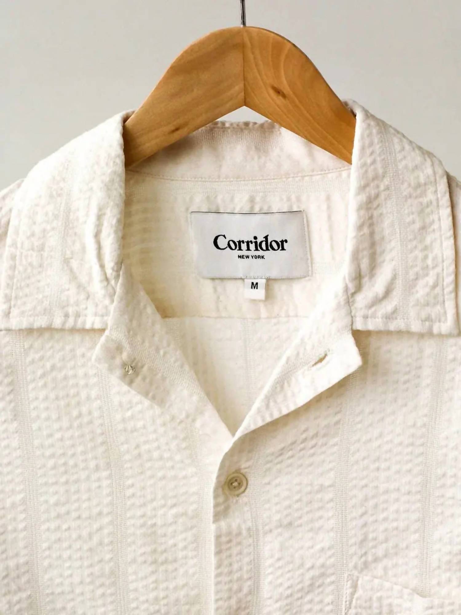 Introducing the Striped Seersucker Shirt by Corridor, a staple for any sophisticated summer wardrobe. This short sleeve shirt in indigo features a unique textured pattern crafted from a soft blend of 60% cotton and 40% viscose. Styled with a classic camp collar and corozo button closure, it offers a versatile and chic look. Proudly made in India, this piece is perfect for travel and leisurely occasions.