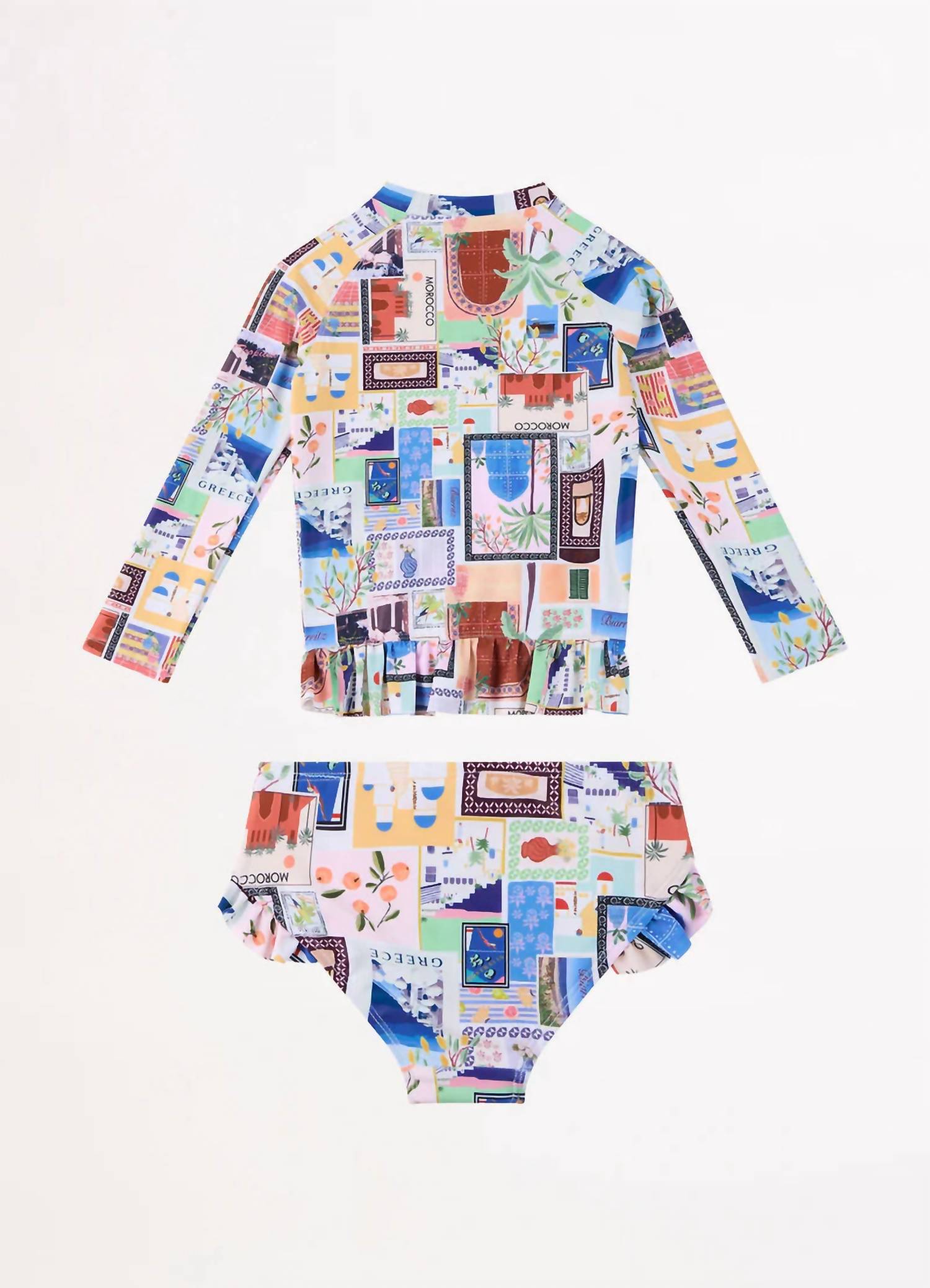 Introducing the Seafolly On Vacation Girls Peplum Surf Set in vibrant Azure, perfect for sunny days on the beach. With long raglan sleeves and a high collar, this set offers UPF 50+ sun protection in the top to shield delicate skin. The peplum ruffle accentuates the design, while the brief features mini ruffles at the leg opening, providing full coverage. Dive into comfort and style with this eye-catching set from Seafolly.