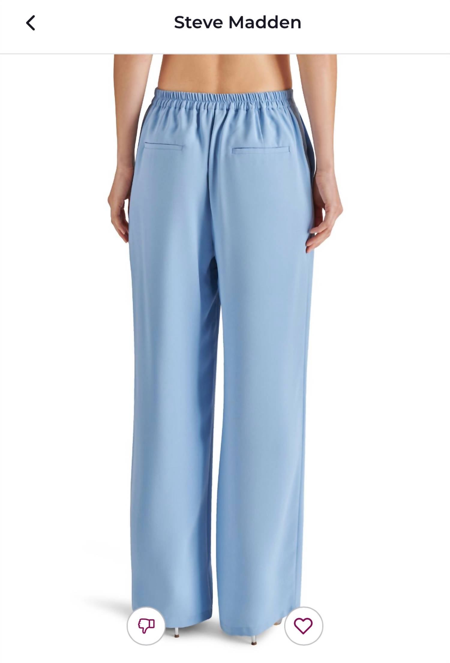 Calça larga. Costas elásticas e braguilha falsa. Sem forro. 2 bolsos laterais funcionais e 2 bolsos traseiros não funcionais. Costura interna: 80 cm. 100% poliéster.