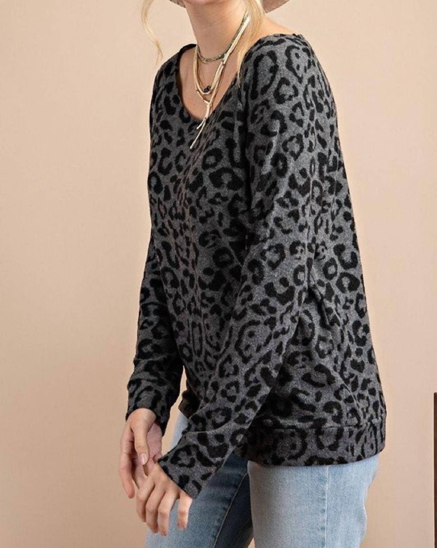 Esta blusa de malha com estampa de oncinha da 143 STORY combina conforto e estilo para uma utilização versátil. Confeccionada em poliéster, esta camiseta com estampa animal print cinza e preta apresenta um elegante decote canoa e mangas compridas. Seu fecho pull-on garante facilidade de uso, seja com leggings para um look casual ou jeans para uma saída à noite. Os cuidados com esta peça são simples: lave à mão e seque no varal para manter sua qualidade.