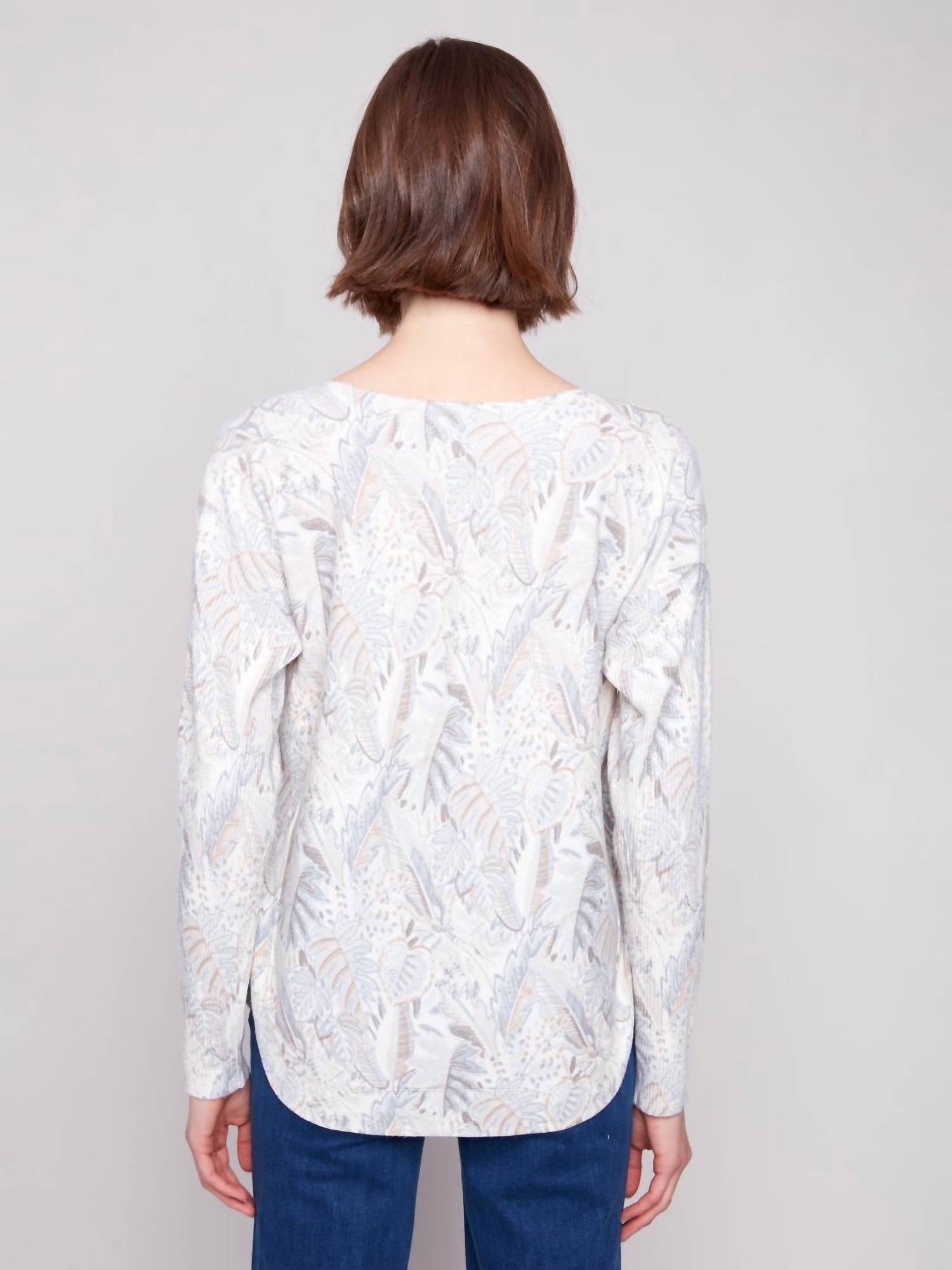 A timeless blouse that will never go out of style. Introducing the Foliage Print Boat Neck Blouse by Charlie B, a chic addition to any wardrobe with its minimalist allure. This women's blouse features long sleeves and a comfortable pull-on style, crafted from a blend of 51% Rayon, 27% Polyester, and 22% Nylon. The elegant boatneck design pairs beautifully with its white base and subtle foliage pattern, perfect for Spring outings or church occasions. Care for this timeless piece with gentle hand washing to maintain its charm.