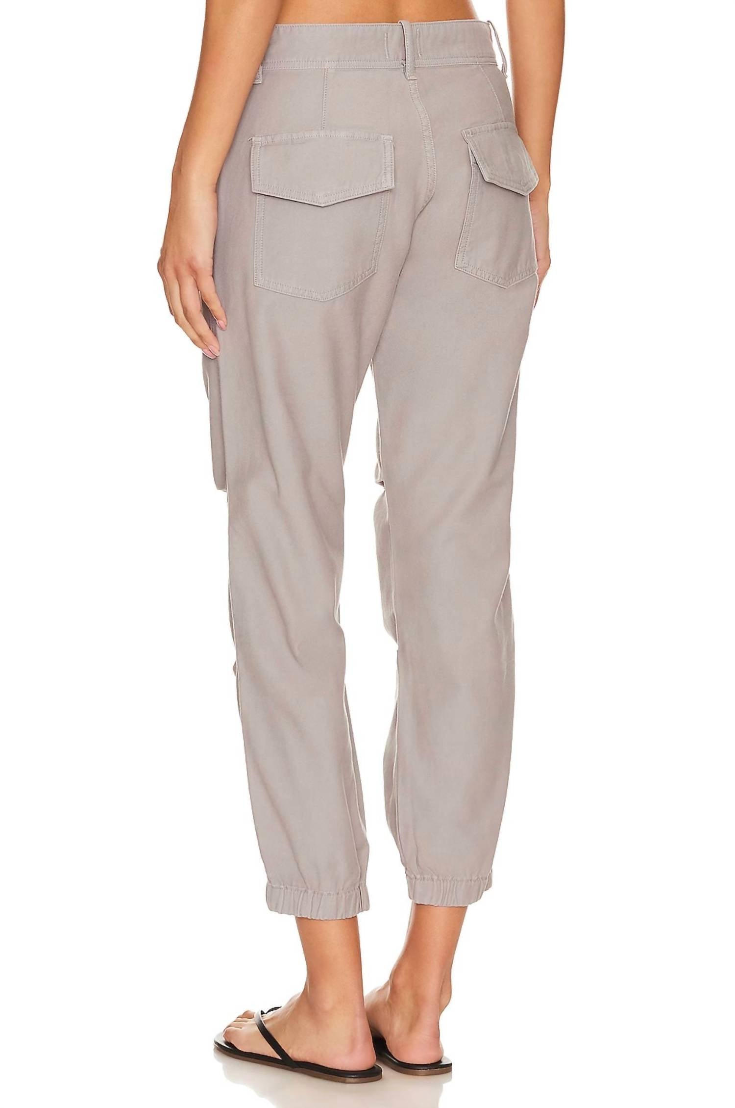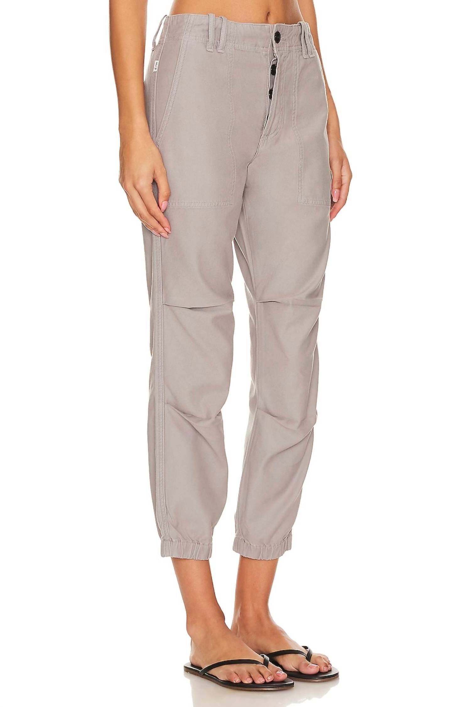 Esta calça apresenta um design de cintura média com pernas afuniladas e relaxadas, além de punhos elásticos. Confeccionada em sarja 100% algodão de gramatura média, possui costura interna de 66 cm, cós de 27 cm, fecho de botão e bolsos funcionais para um ajuste prático e elegante.