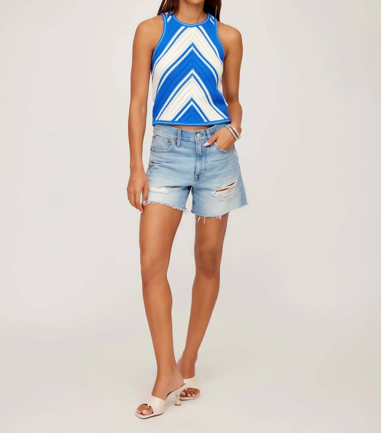 A regata perfeita para as estações mais quentes. Eleve seu guarda-roupa com a Regata Alice Crochet da Fifteen Twenty, uma peça versátil e essencial sem mangas em um tom azul deslumbrante. Esta regata possui gola redonda e design justo, com um padrão chevron exclusivo em crochê e detalhes em pontos largos. Confeccionada com materiais de qualidade, é um modelo prático e perfeito para transitar de ocasiões casuais para ocasiões mais luxuosas. Aprimore seu estilo para as férias de verão com esta regata chique, ideal para combinar com shorts de cintura alta ou com a Saia de Crochê Amber.